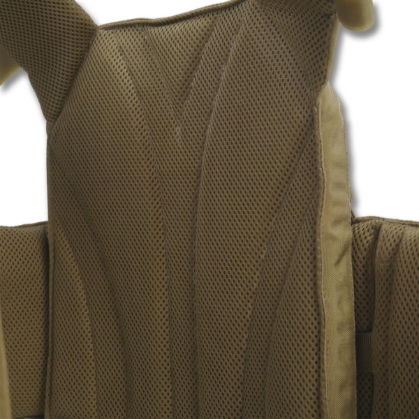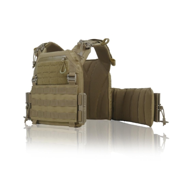 Подвійна система швидкого скидання на плечах і камербандах дозволяє зняти плитоноску за кілька секунд. Основна тканина — Cordura Nylon 6.6 1000D з NIR-просоченням та подвійним поліуретановим покриттям, стійка до вологи, стирання та вигорання. Внутрішні частини обладнані демпферними вставками з 3D-сіткою для вентиляції та амортизації.
