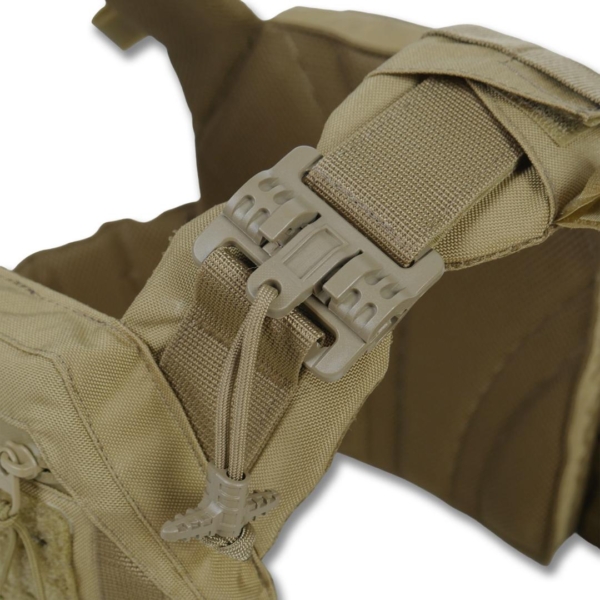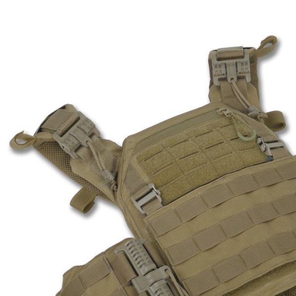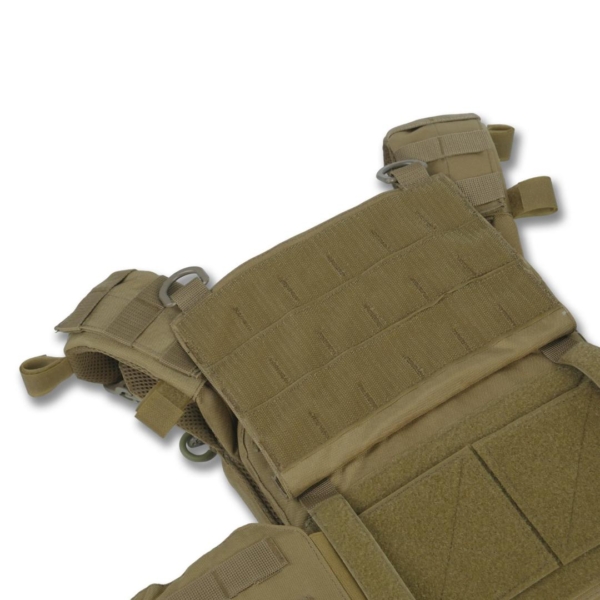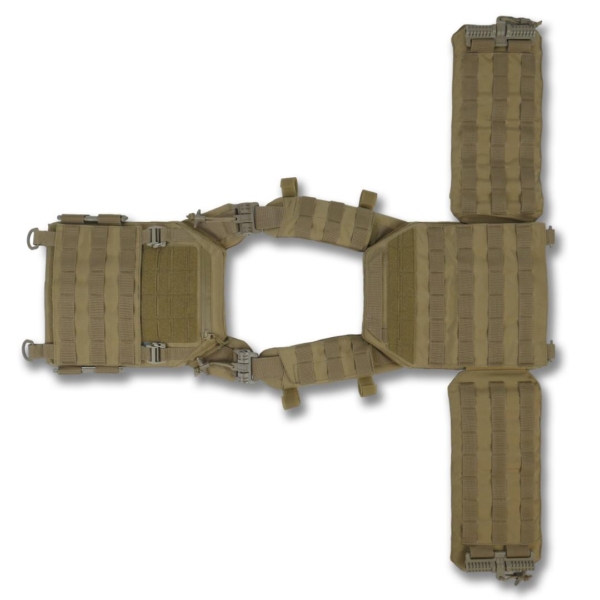 Сумісна зі стандартними плитами 25×30 мм зі скошеними верхніми кутами товщиною до 30 мм. Оснащена з’ємною передньою панеллю Molle, яка кріпиться на Velcro та карабіни Woojin. На ній можна розміщувати підсумки або інше Molle-сумісне спорядження. Панель легко замінюється на іншу з готовим набором.