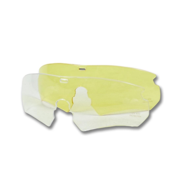 - Лінзи з полікарбонату товщиною 1–1,5 мм забезпечують захист від дрібних уламків, бетонних крихт, трісок та страйкбольних кульок.