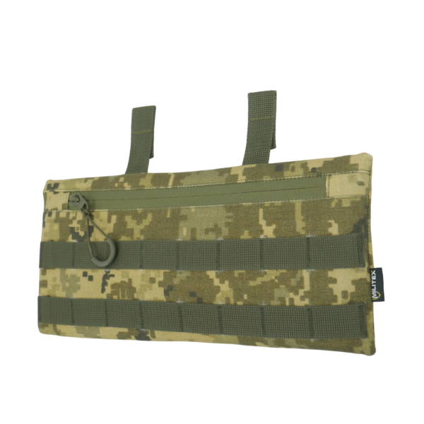 Балістичний пакет легко вставляється та надійно фіксується у чохлі завдяки велкро. На фронтальній частині передбачено два ряди MOLLE, а також кишеня з прорезиненим бігунком і пулером для зручного зберігання карт, документів чи дрібних речей.