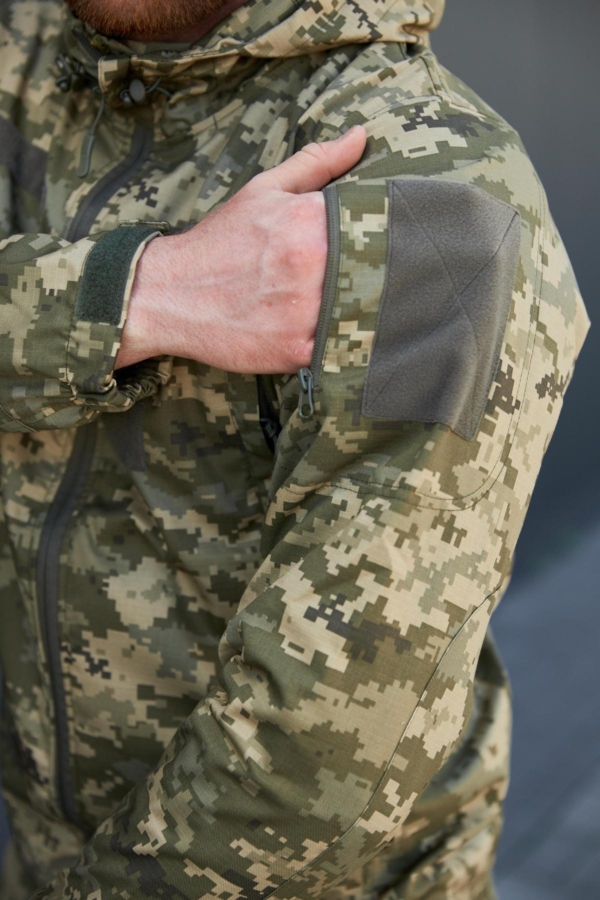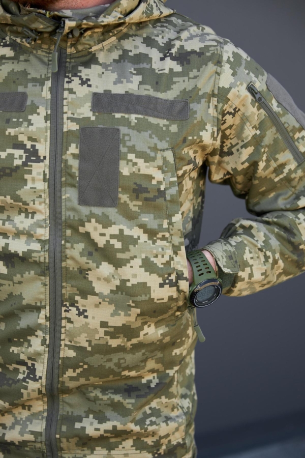 - Функціональність: У куртці передбачені м'які велкро-панелі для кріплення шевронів. Вона має глибокі кишені на блискавках, а також кишені з обох сторін на рукавах для зручного зберігання необхідних речей.