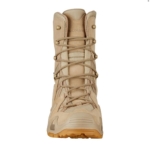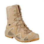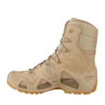 Тактичні черевики Lowa Zephyr GTX HI TF Пустеля, з висотою голенища 228 мм, виготовлені з різних матеріалів, що забезпечують їх міцність, зносостійкість, водонепроникність та повітропроникність. Верх виконаний з піщаної замші та міцної Cordura® і прошитий двома паралельними швами. Пластикова вставка в області п'яти забезпечує додаткову підтримку під час сідання або спуску по схилу. Язичок виготовлений повністю з Cordura.