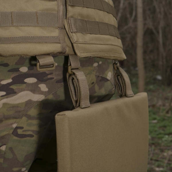 - також можна фіксувати сидушку за допомогою спеціальних строп на липучці на систему Molle на плитоноску чи пояс РПС;