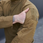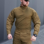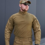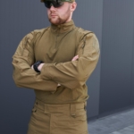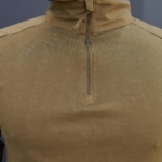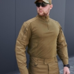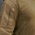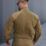 Сорочка виготовлена з міцної ріп-стоп тканини, а центральна частина — з бавовняного трикотажу, що забезпечує комфорт та свободу рухів. Передбачені кишені на блискавках на рукавах та м’які велкро-панелі для шевронів.