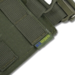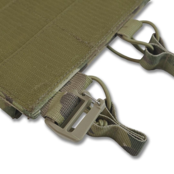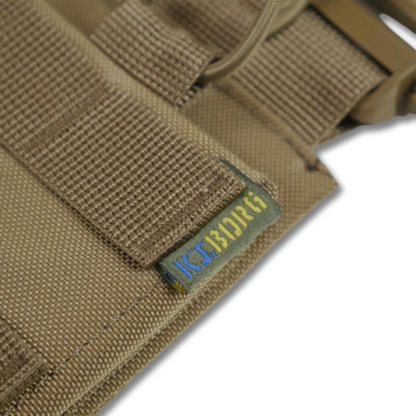 Завдяки продуманій конструкції, робоча поверхня хвату магазина залишається відкритою, тому маніпуляції з ним відбуваються набагато швидше. З боків і з переду ми додали пластик, щоб підсумок був надійним та добре тримав форму. Також і сама основа усієї платформи виготовлена з пластику та Кордури, такий спосіб забезпечить максимальну якість та комфорт у користуванні. Фурнітура - пластикові рамки з замком від Японського виробника WJ у формі D-кільця, які слугують з’єднувальним елементом в поєднанні з велкро липучкою дозволяють прикріпити панель на передній частині плитоноски і за потреби швидко зняти її.