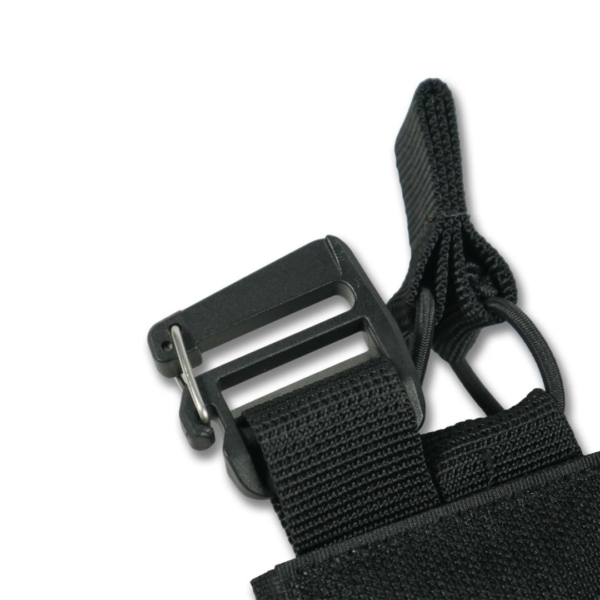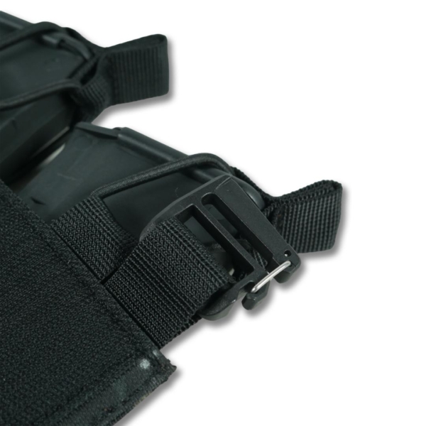 Система фіксації магазинів здійснюється за допомогою еластичної резинки та страхової стропи з «вушками», що забезпечують надійний захист від випадання.