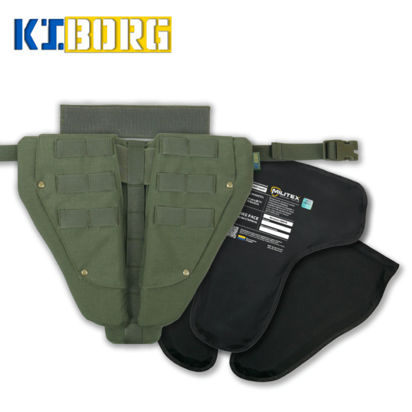 Модульний балістичний напашник Kiborg з балістичним захситом 2 класу захисту від компаінї Militex, спеціально розроблений для надання стабільного та правильно орієнтованого захисту паху та нижньої частини живота у різних позиціях.