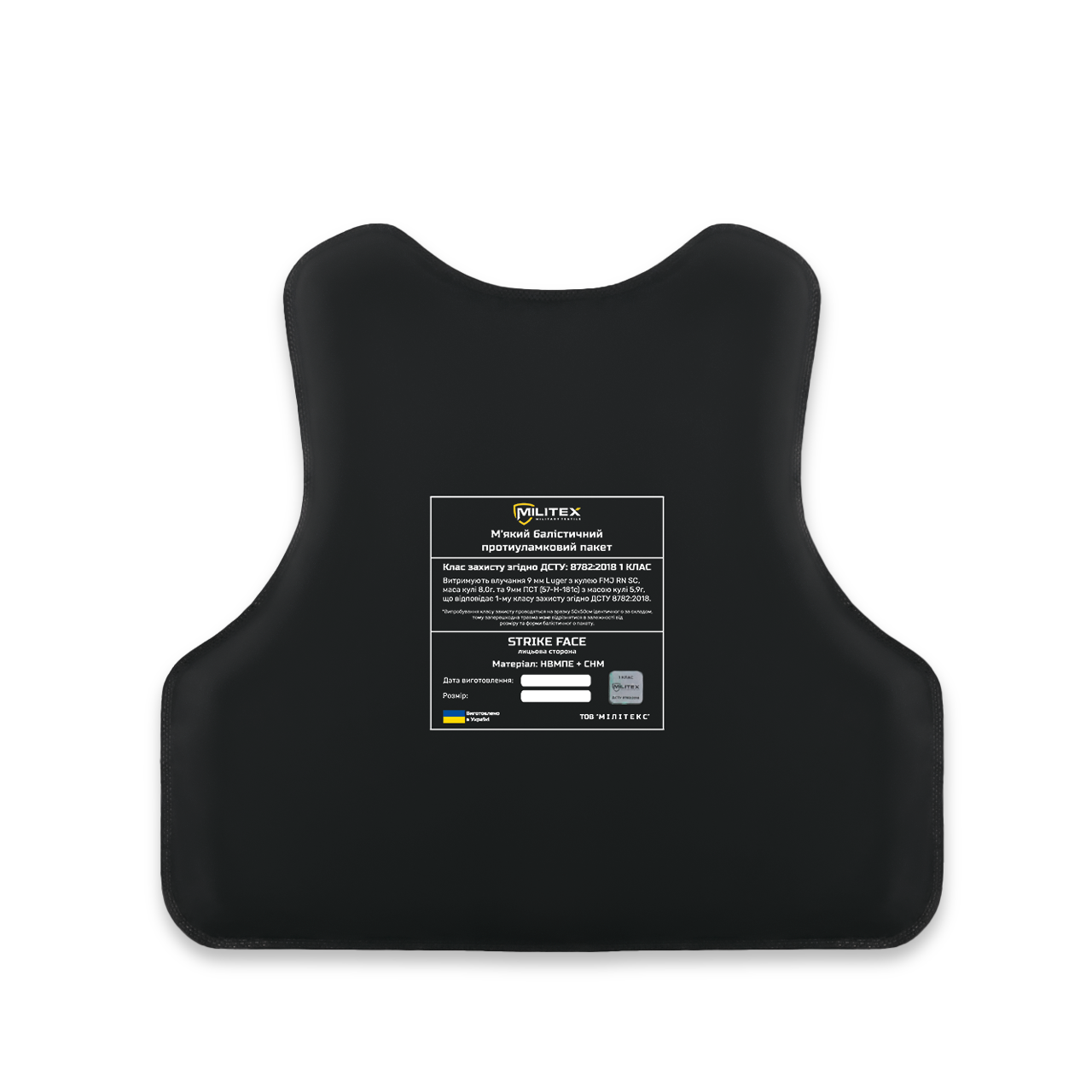 - кулею 9х19 мм Luger (швидкість401±1 м/c) у суцільнометалевій оболонці з мідного сплаву з носовою частиною напівсферичної форми з мʼяким (свинцевим) осердям згідно з вимогами п. 6.1.2.(за нормальних умов експлуатування), п. 7.1.1, табл. 1 ДСТУ 8782:2018 “Засоби індивідуального захисту. Бронежилети.”, щодо 1 класу захисту; максимальна глибина позаперешкодної деформації – 20,0 мм.