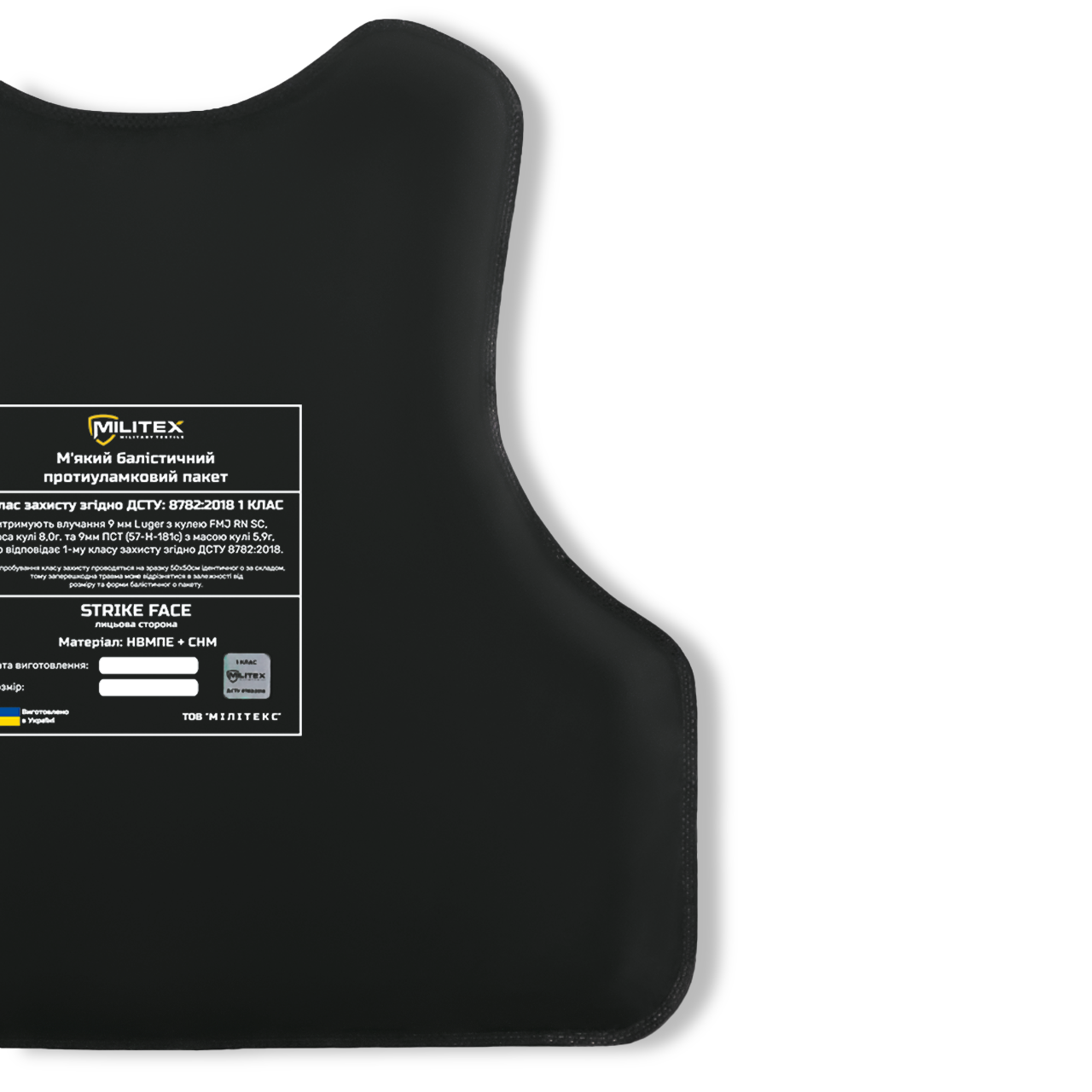 *Під 1 класом розуміється еквівалент за складом, який випробовується на стандартних лабораторних зразках 500х500мм, тому позаперешкодна травма може відрізнятися взалежності від розміру та форми балістичного пакету.