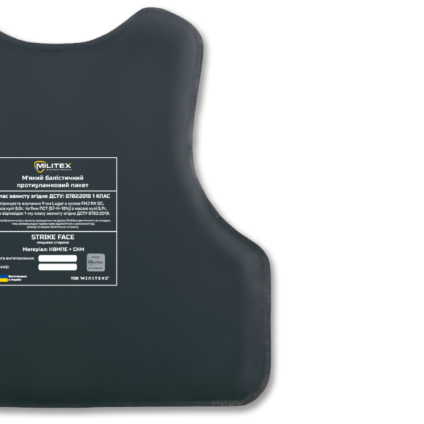 *Під 1 класом розуміється еквівалент за складом, який випробовується на стандартних лабораторних зразках 500х500мм, тому позаперешкодна травма може відрізнятися взалежності від розміру та форми балістичного пакету.