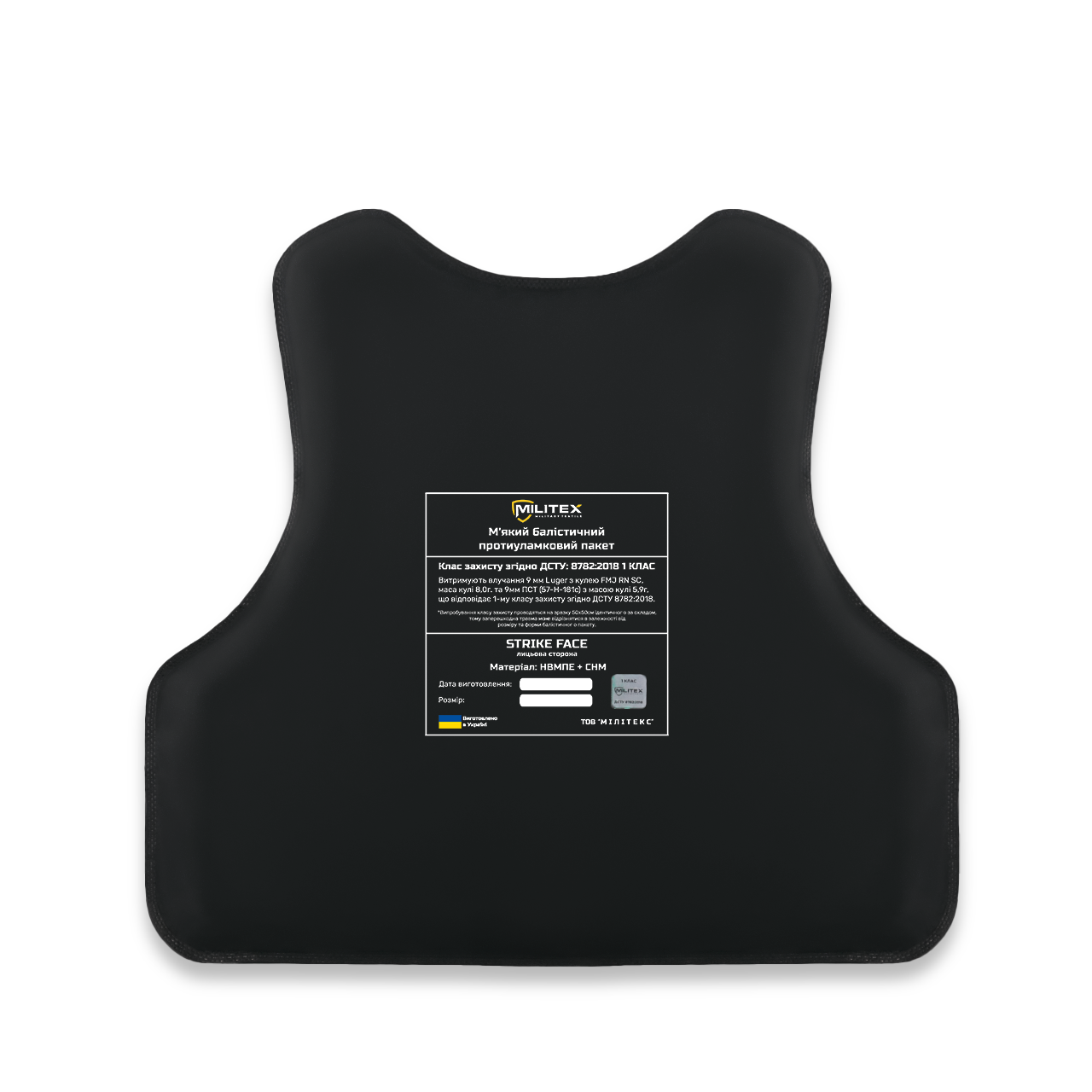 - кулею 9х19 мм Luger (швидкість401±1 м/c) у суцільнометалевій оболонці з мідного сплаву з носовою частиною напівсферичної форми з мʼяким (свинцевим) осердям згідно з вимогами п. 6.1.2.(за нормальних умов експлуатування), п. 7.1.1, табл. 1 ДСТУ 8782:2018 “Засоби індивідуального захисту. Бронежилети.”, щодо 1 класу захисту; максимальна глибина позаперешкодної деформації – 20,0 мм.