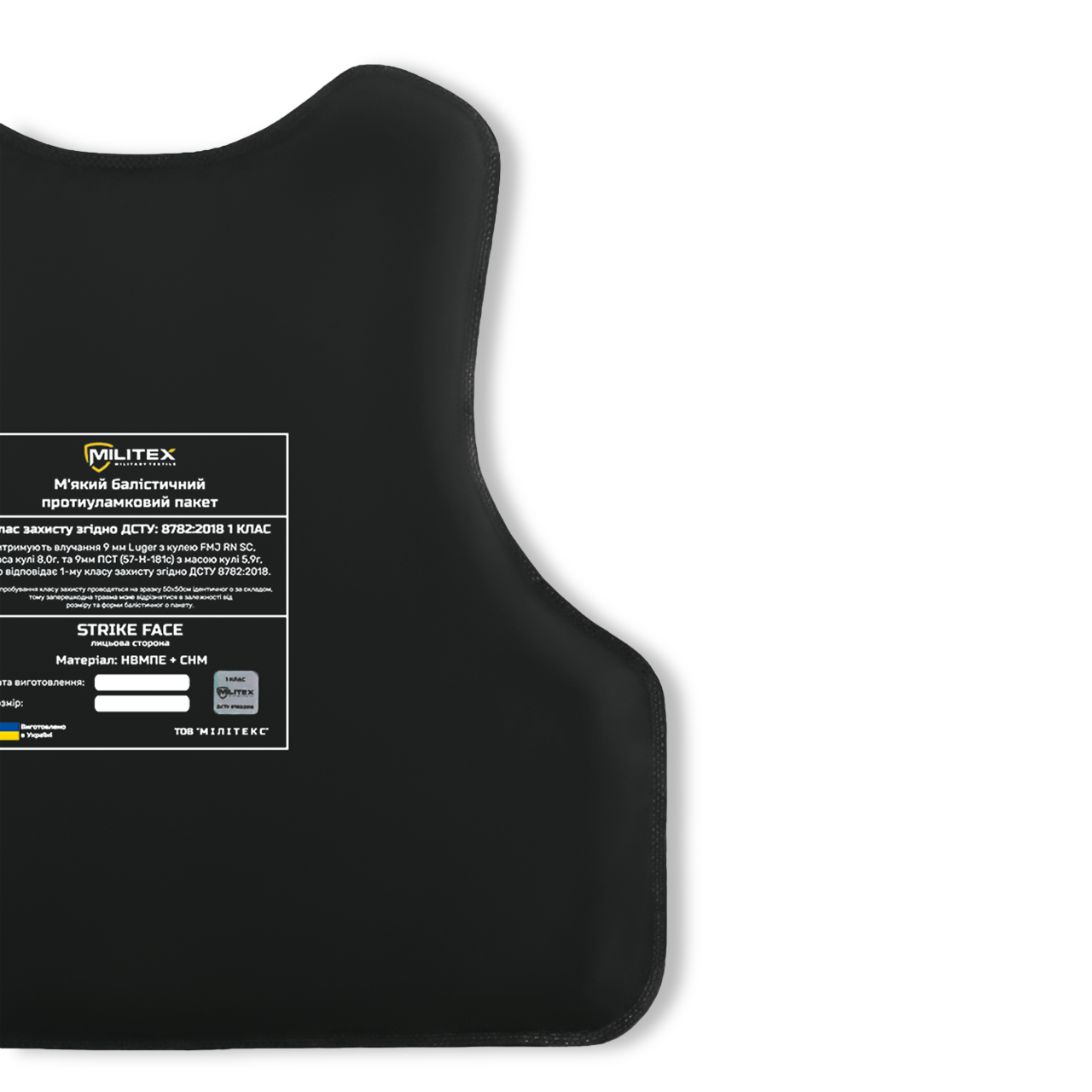 *Під 1 класом розуміється еквівалент за складом, який випробовується на стандартних лабораторних зразках 500х500мм, тому позаперешкодна травма може відрізнятися взалежності від розміру та форми балістичного пакету.