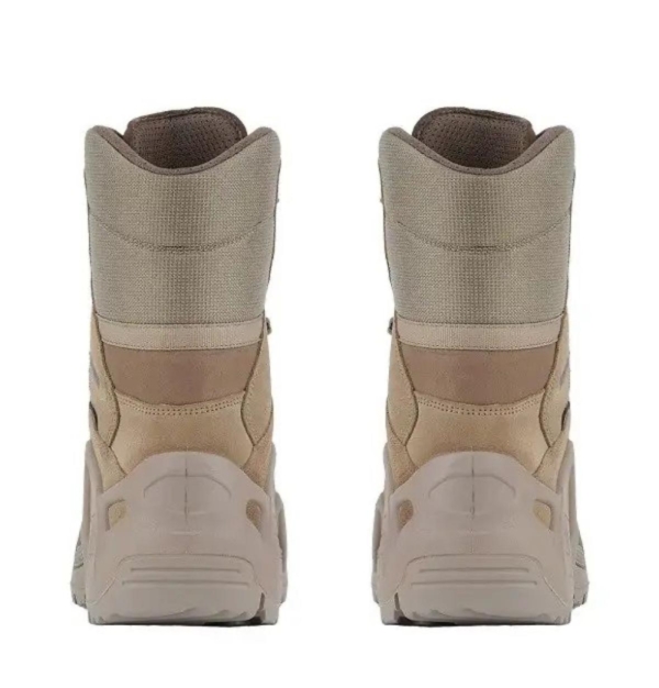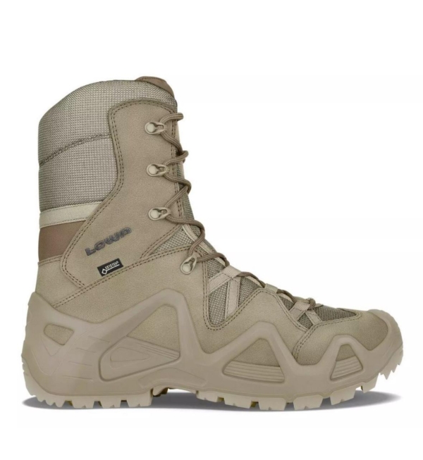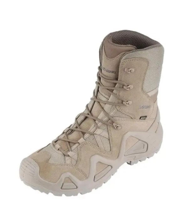 Тактичні черевики Lowa Zephyr GTX HI TF Койот, з висотою голенища 228 мм, виготовлені з різних матеріалів, що забезпечують їх міцність, зносостійкість, водонепроникність та повітропроникність. Верх виконаний з піщаної замші та міцної Cordura® і прошитий двома паралельними швами. Пластикова вставка в області п'яти забезпечує додаткову підтримку під час сідання або спуску по схилу. Язичок виготовлений повністю з Cordura.