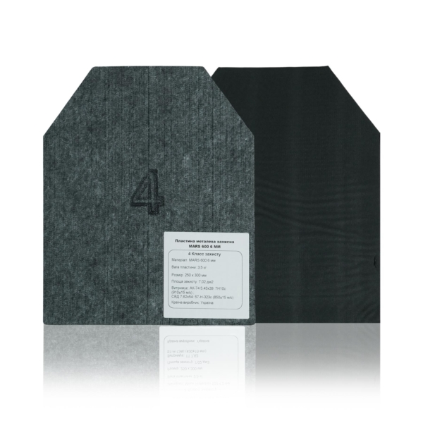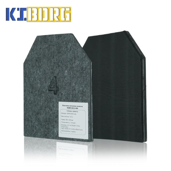 Бронеплити MARS 600 поєднують в собі високий рівень захисту та оптимальні габарити. Товщина матеріалу – 6 мм, вага однієї плити – 3,5 кг, забезпечуючи хороший баланс між захистом і зручністю. Розміри плити становлять 250x300 мм.