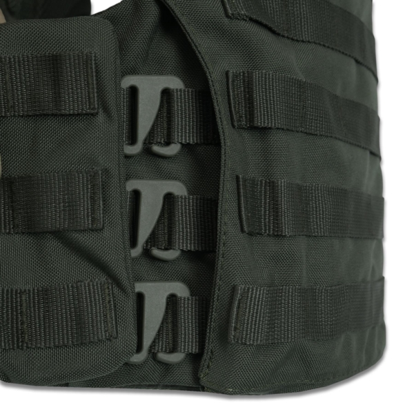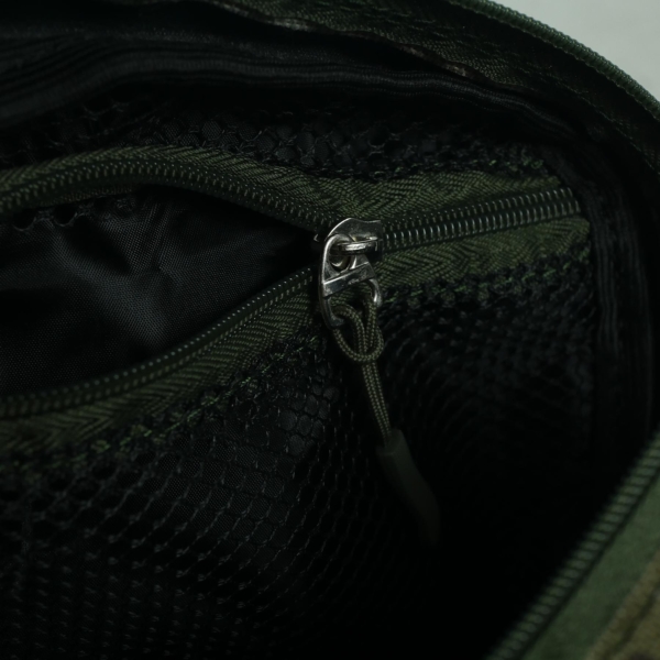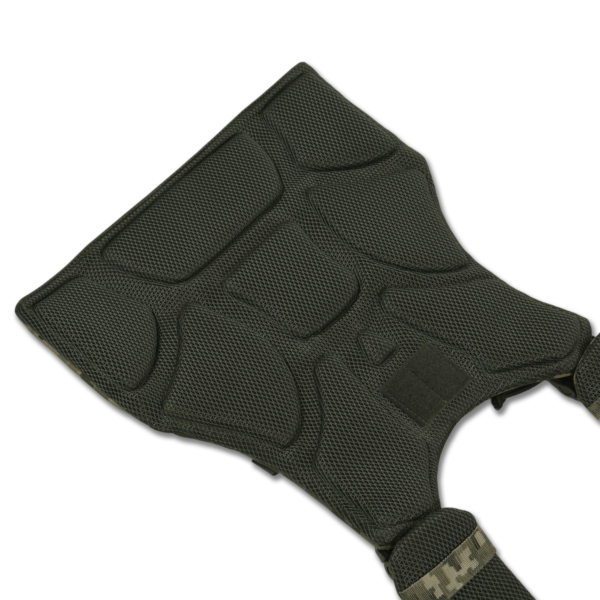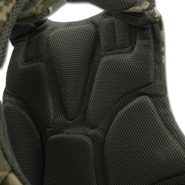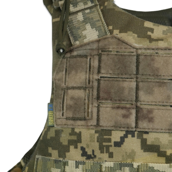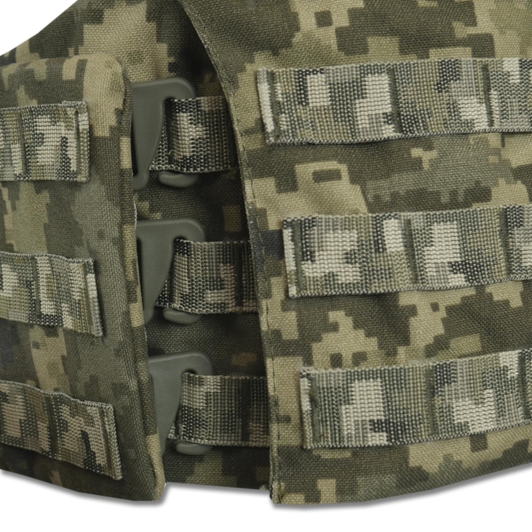 - передня частина з MOLLE-панеллю (5 рядів, 8 комірок), посиленою велкро-панеллю та додатковими прорізами