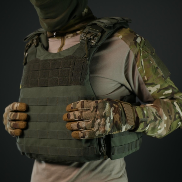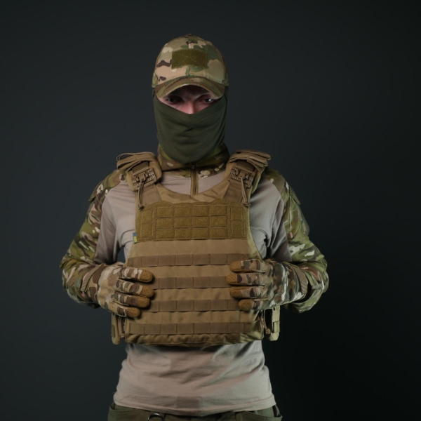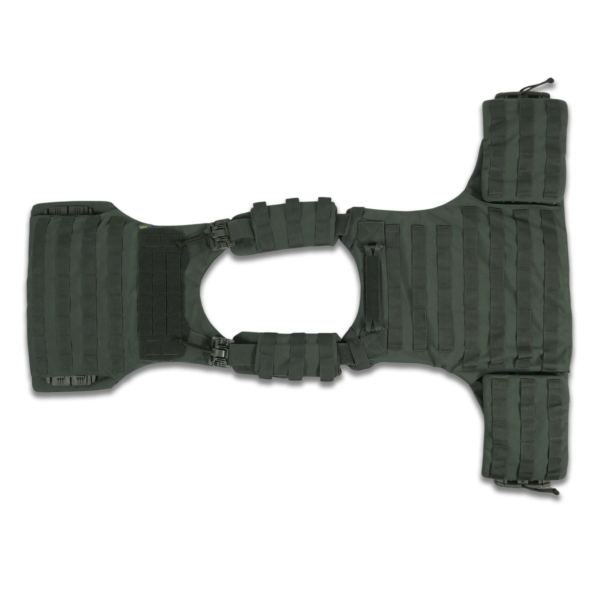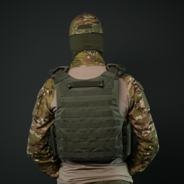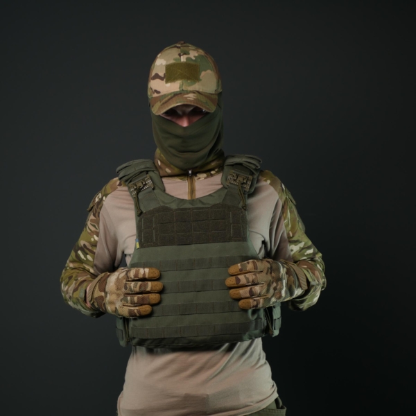 Жилет Kiborg зі збільшеною площею захисту — модульна система, створена за прототипом американських моделей та адаптована під сучасні вимоги. Комплект включає вісім модулів: передню та задню частини, два камербанди, дві плечові лямки й двочастинний бондаж.