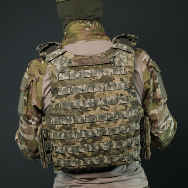 - задня частина з більшою кількістю MOLLE-позицій та евакуаційною ручкою, посиленою закріпками