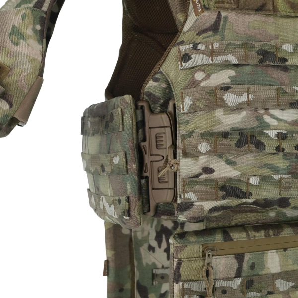 Жилет регулюється по зросту та розміру, оснащений ортопедичними вставками, демпферними подушками та кріпленнями для додаткових модулів. Камербанди мають кишені під балістичні пакети та систему покрокового регулювання з фіксатором.
