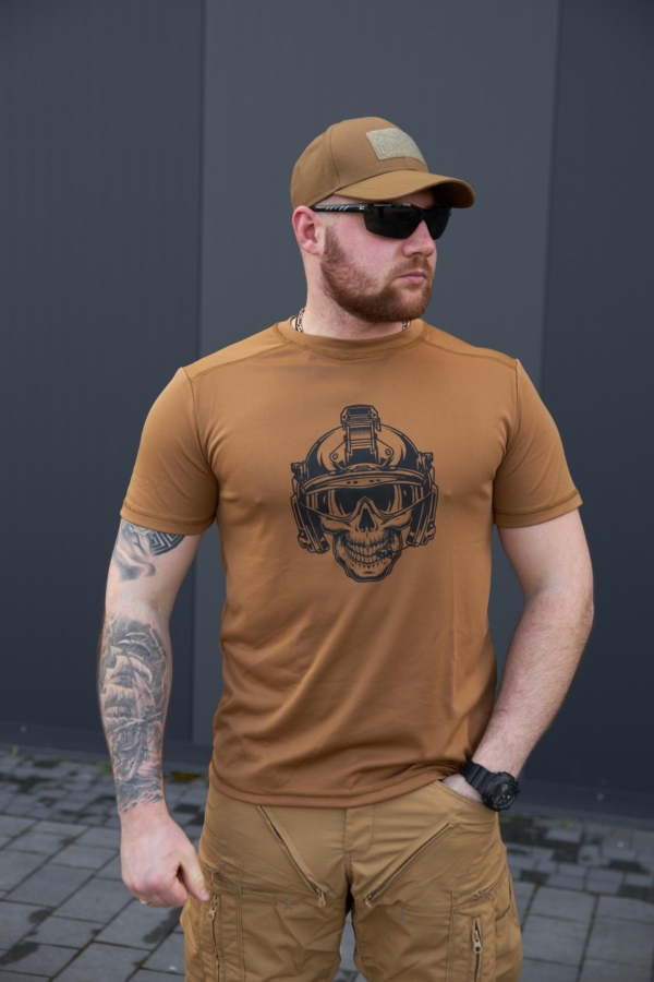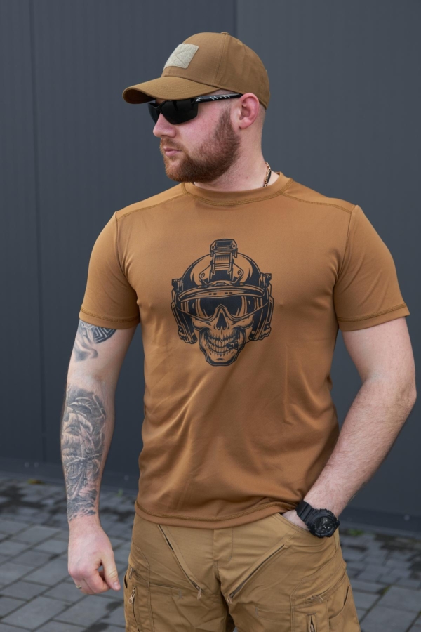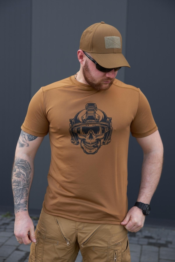 Футболка пошита з тканини Coolmax Аntistatic. Це антистатична та антибактеріальна тканина, яка завдяки спеціальній структурі ефективно виводить вологу з поверхні шкіри, чим захищає організм від перегріву та залишає шкіру сухою. Тканина не вигоряє, не мнеться і не сідає після прання. На футболку нанесено якісний принт "Череп".