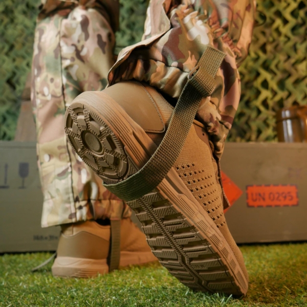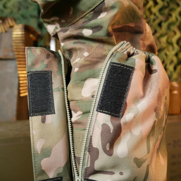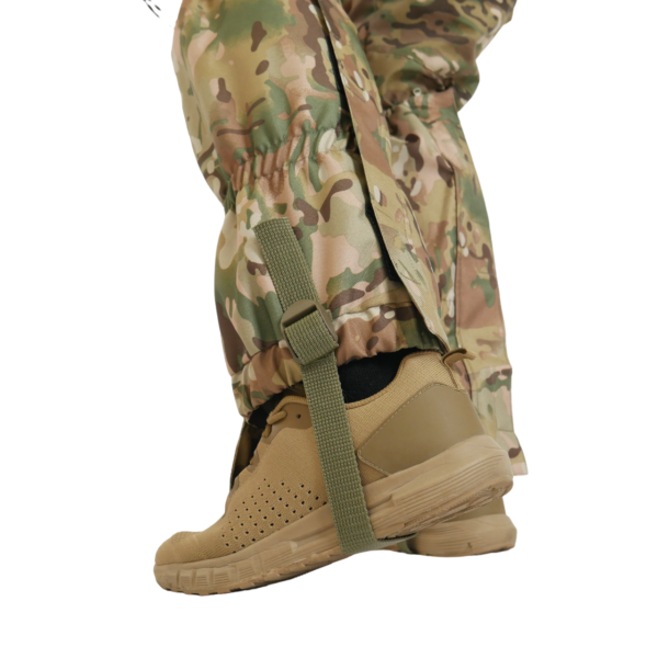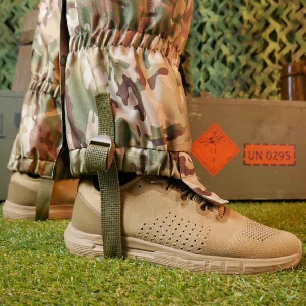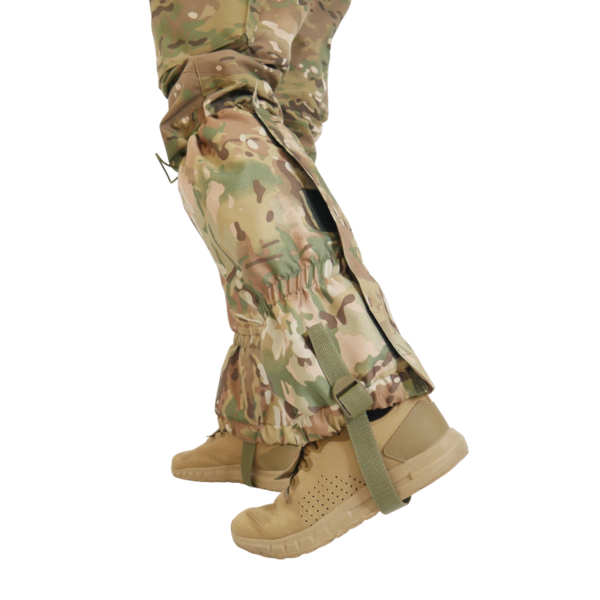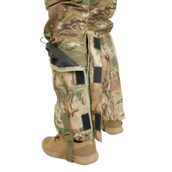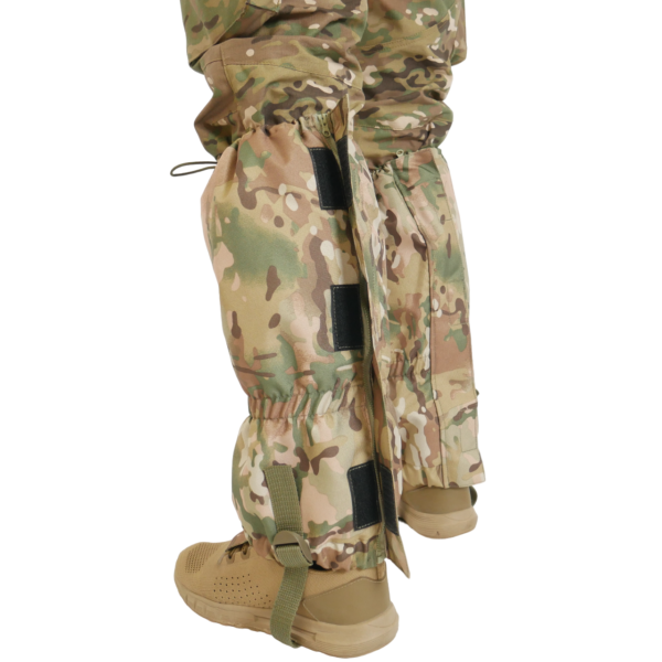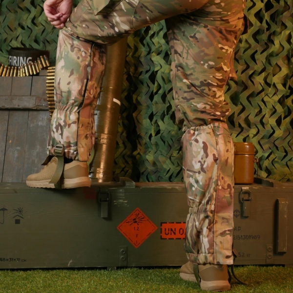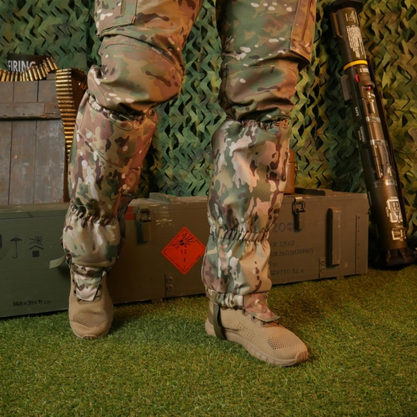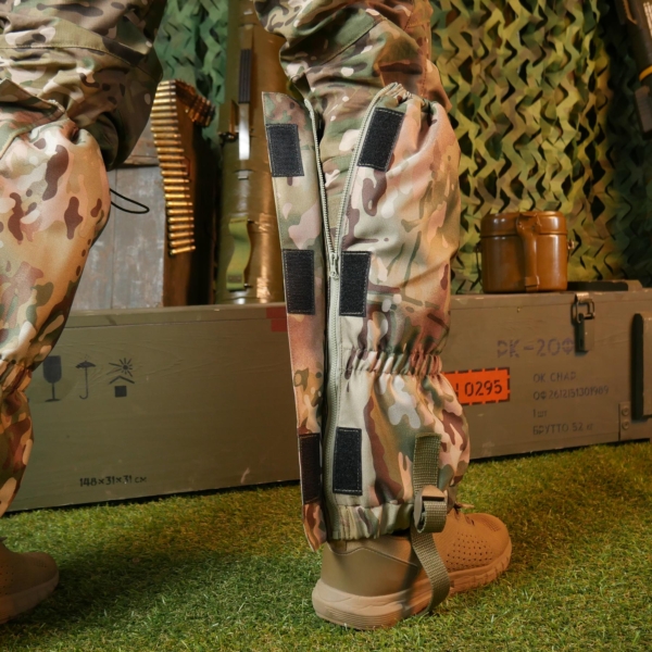 У виготовленні застосована міцна водонепроникна тканина Oxford 600D щільністю 230 г/м² з внутрішньою підкладкою. Нижня частина фіксується металевим гачком до шнурівки взуття, що запобігає спаданню чи перекручуванню. Задня застібка-блискавка прикрита клапаном із трьома липучками для швидкого одягання й надійної фіксації.