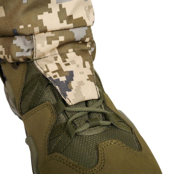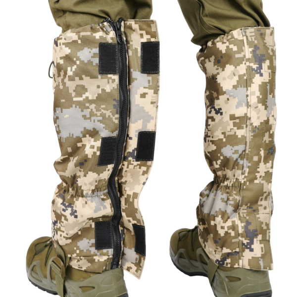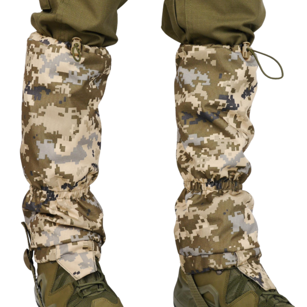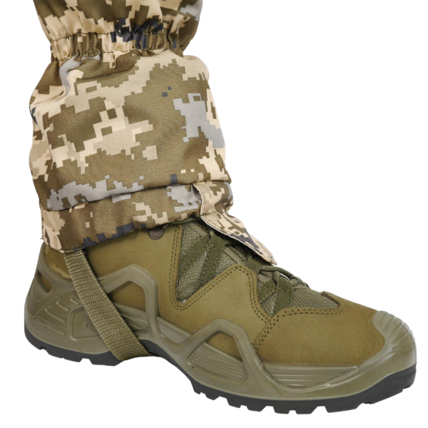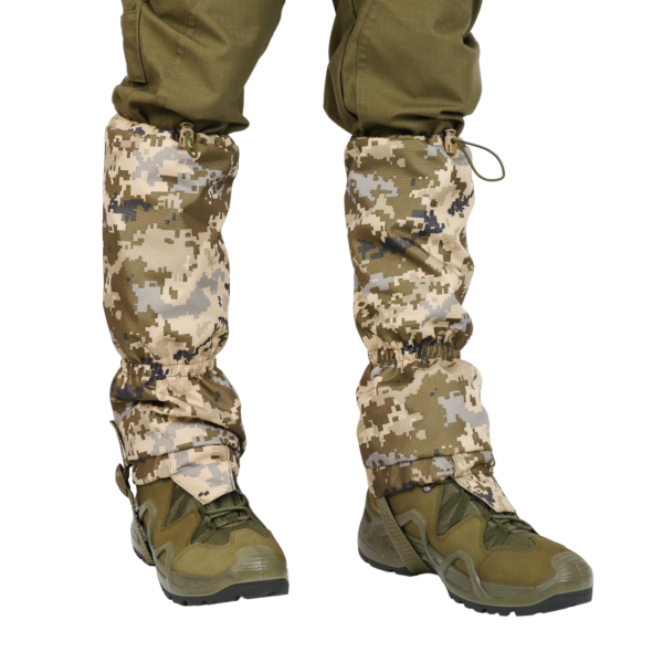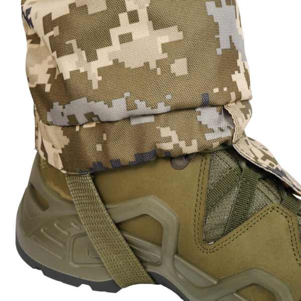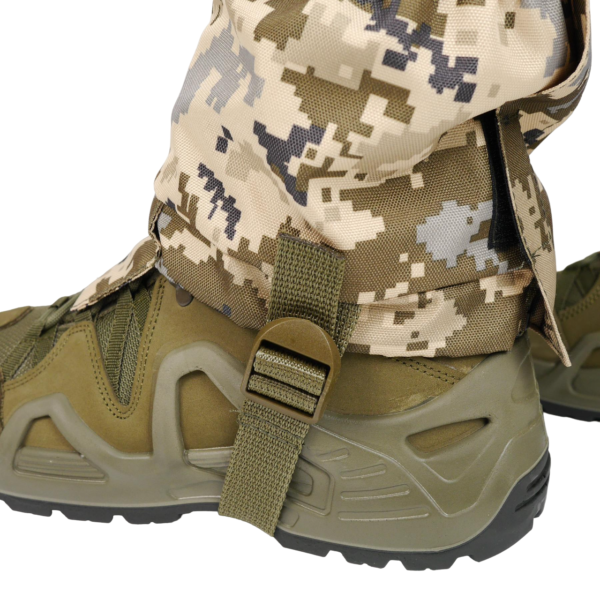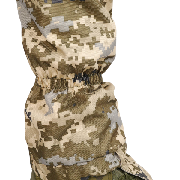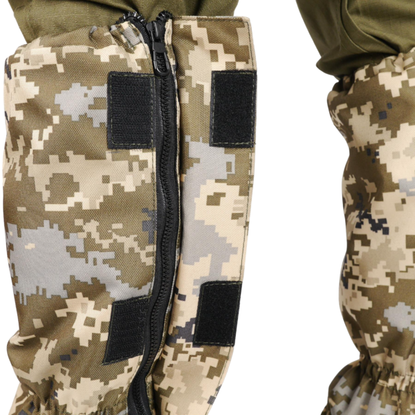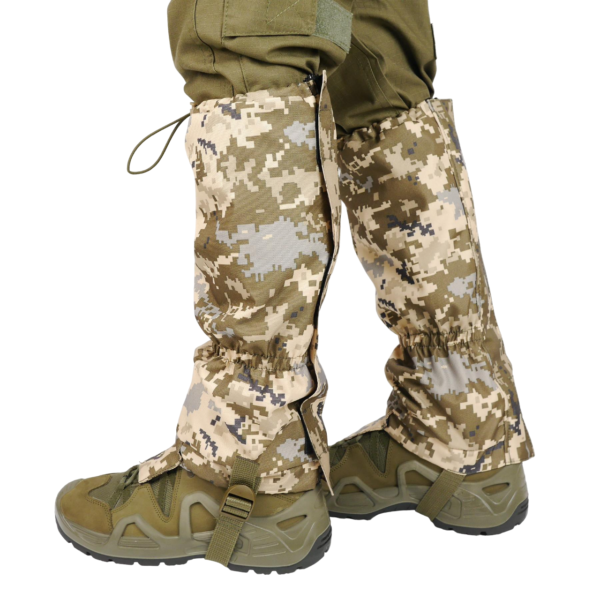 Виготовлені з міцної водонепроникної тканини Oxford 600D щільністю 230 г/м² з підкладкою. Нижня частина фіксується металевим гачком до шнурівки взуття, що запобігає спаданню та перекручуванню. Ззаду застібка-блискавка закрита клапаном на липучках для додаткової герметичності.