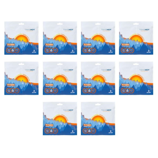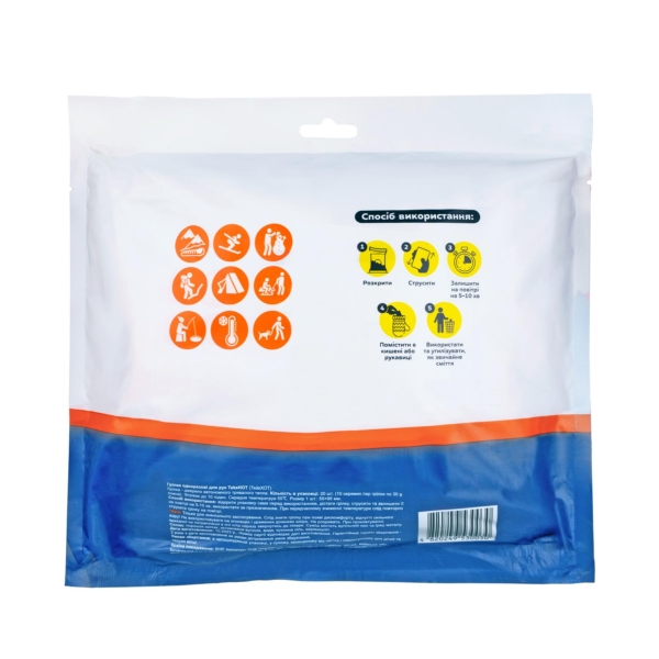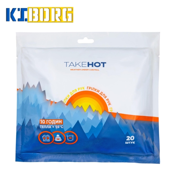 TakeHot — це одноразові грілки для рук, що активуються при контакті з повітрям. Вони безперервно виробляють тепло до 10 годин. Грілки можна покласти в рукавички або кишені штанів/куртки.