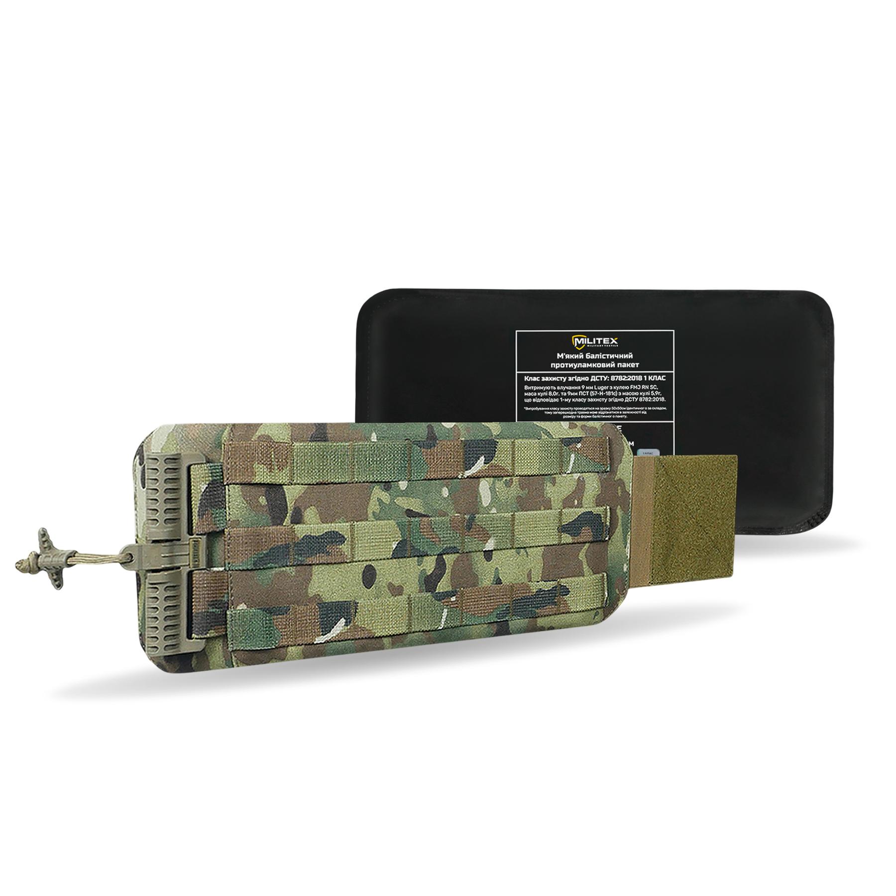 2 × мʼякі балістичні пакети MILITEX, розмір 30,5 × 13,5 см, 1-й клас захисту.