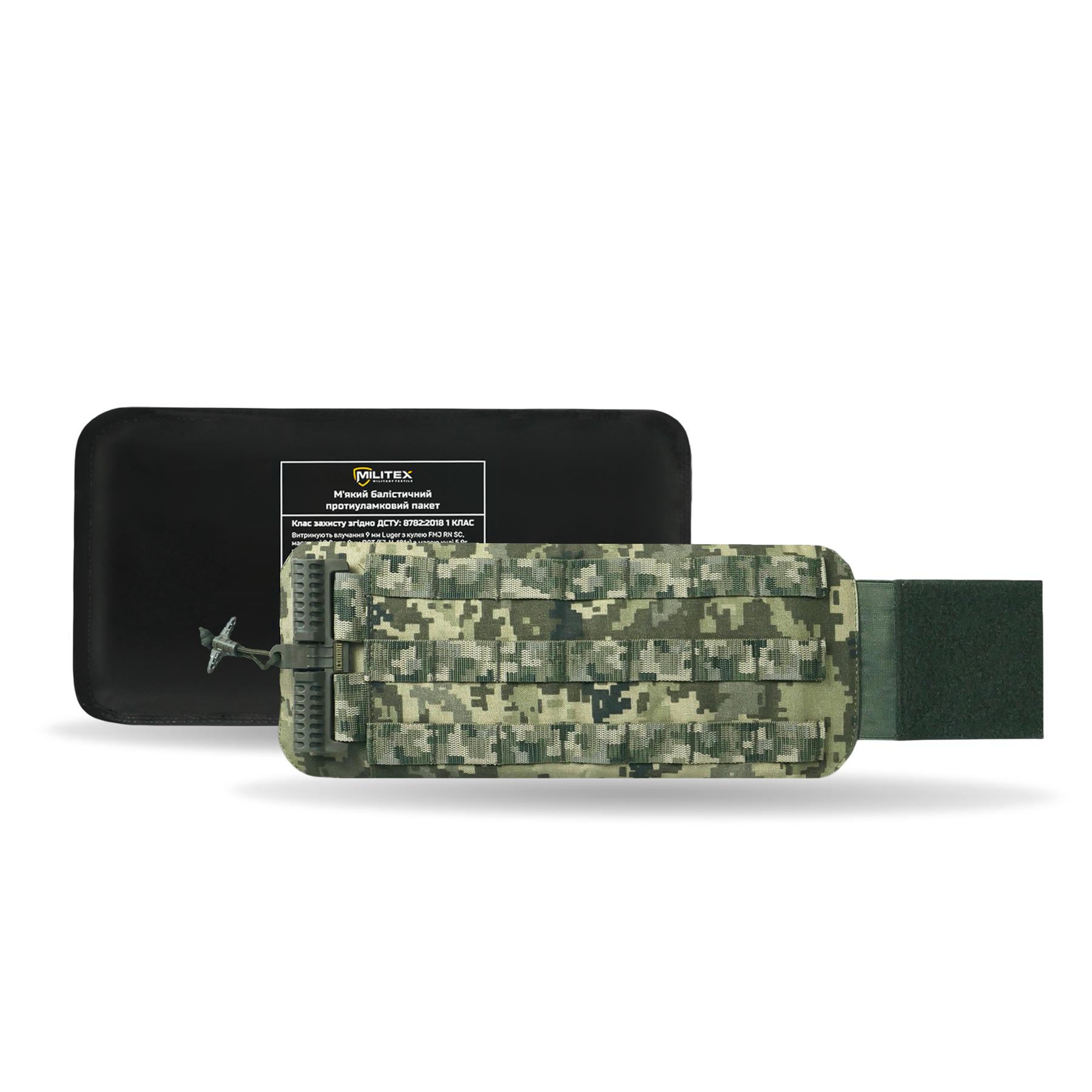 2 × мʼякі балістичні пакети MILITEX, розмір 30,5 × 13,5 см, 1-й клас захисту.