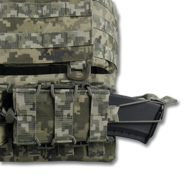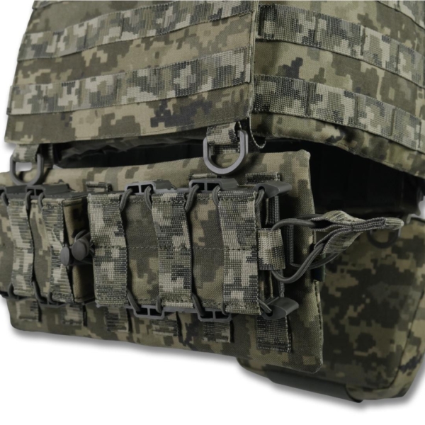 Навантажені вузли та всі елементи системи Molle підсилені зигзагоподібними швами нитками Tytan, прошитими на спеціальній закріпочній машині.