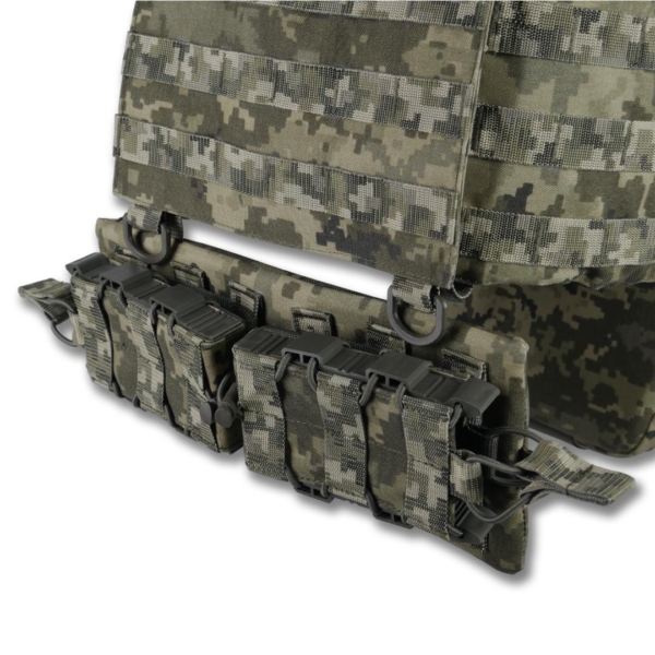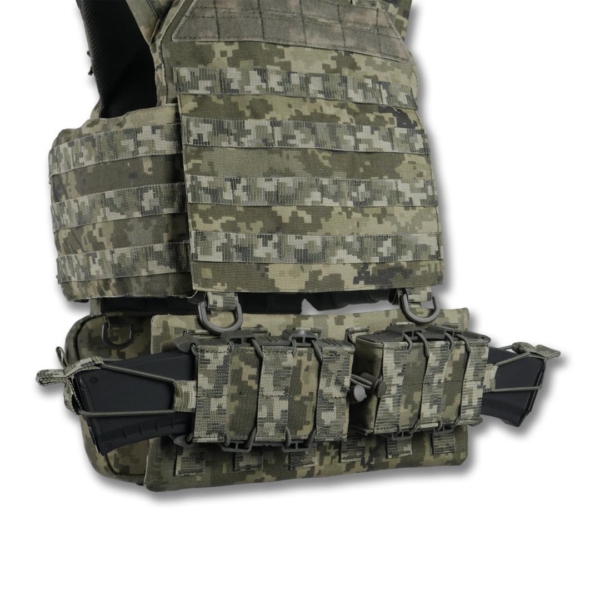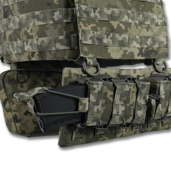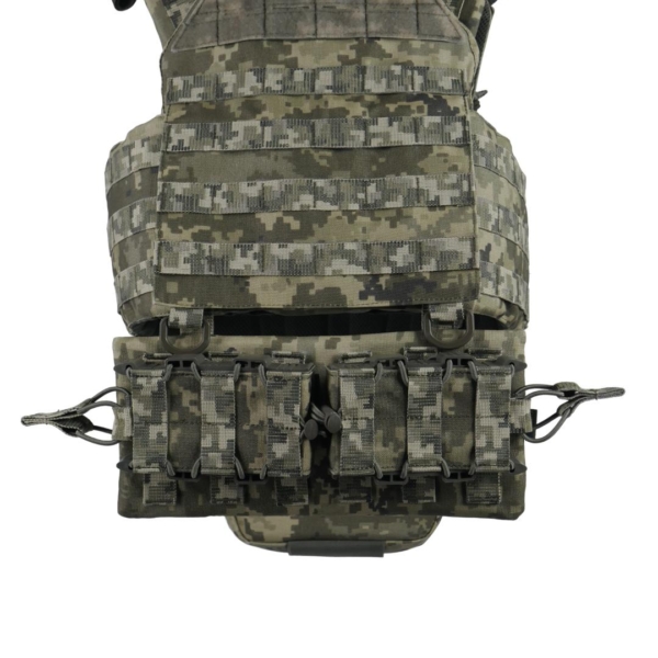 Передня знімна панель кріпиться на Velcro та додатково фіксується карабінами Woojin. Вона підходить для розміщення підсумків чи іншого Molle-сумісного спорядження та може швидко замінюватися.
