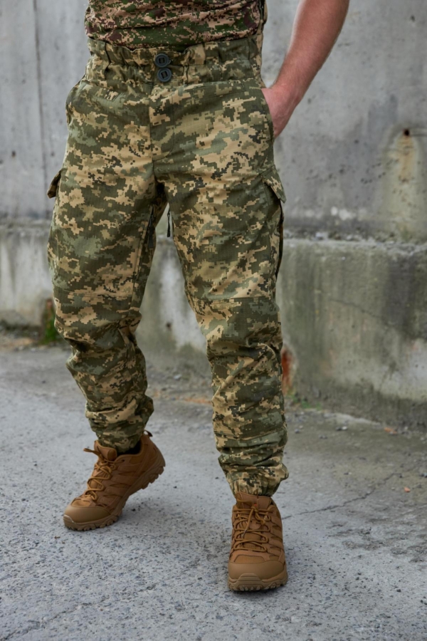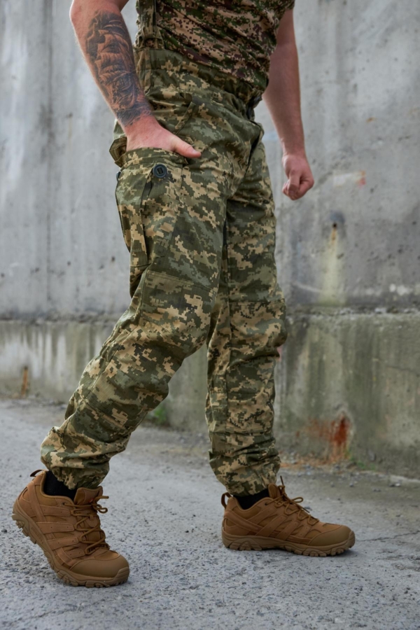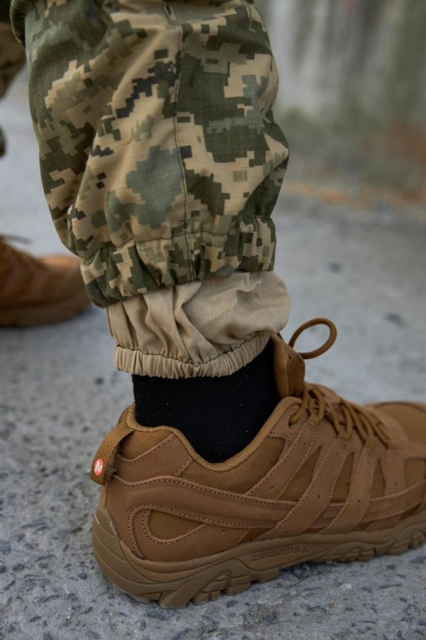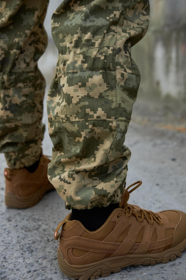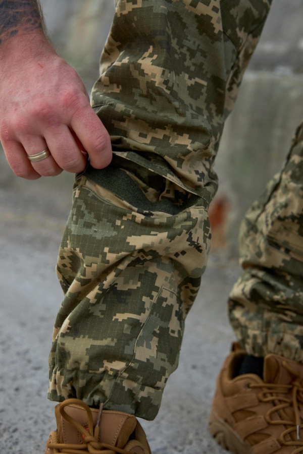 - Знизу штанина всередині оснащена додатковою тканинною на гумці, яка виступає глухим клапаном (надягається на черевик), що захищає від комах, бруду та пилу.