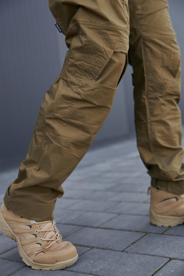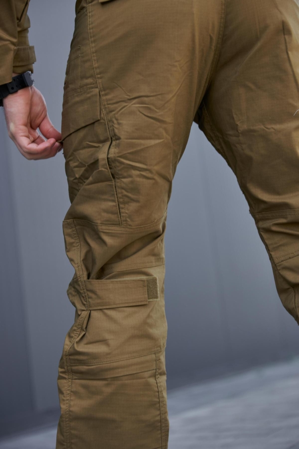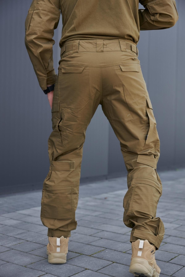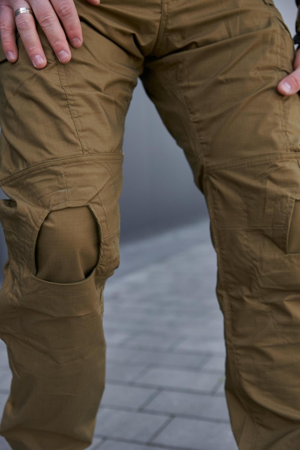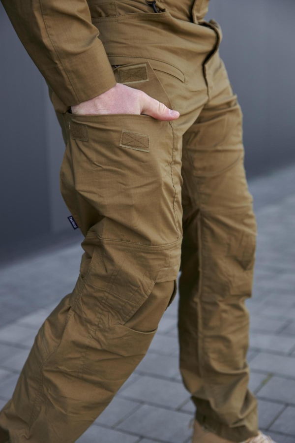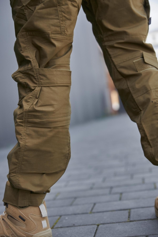 Штани обладнані відділами для зовнішніх наколінників, що підвищує захист під час інтенсивних навантажень. Низ штанин регулюється липучками, а в талії передбачене регулювання за допомогою задніх липучок, що дозволяє підігнати посадку індивідуально. Тканина ріп-стоп відзначається високою зносостійкістю та довговічністю.