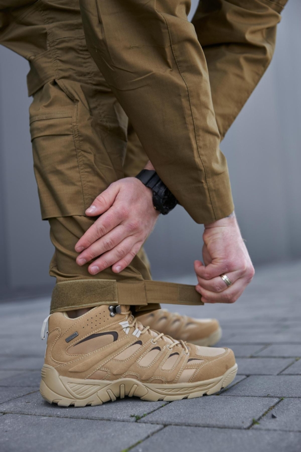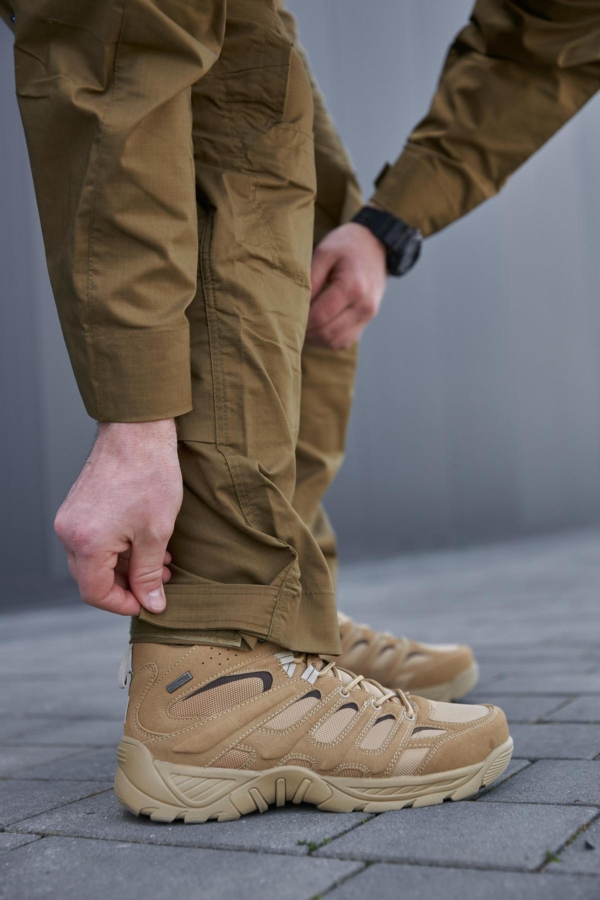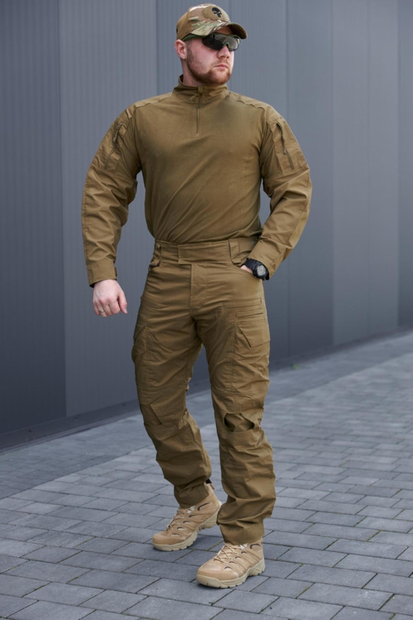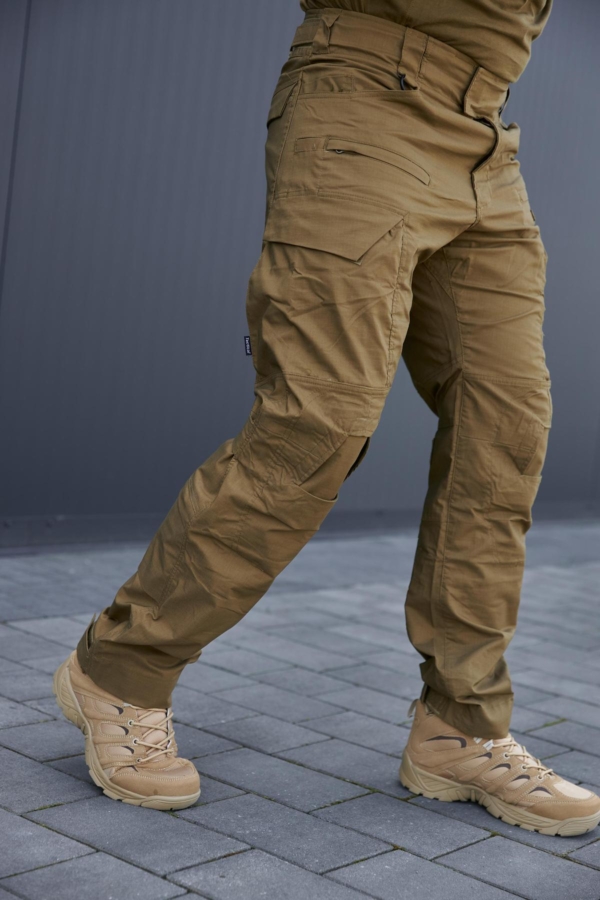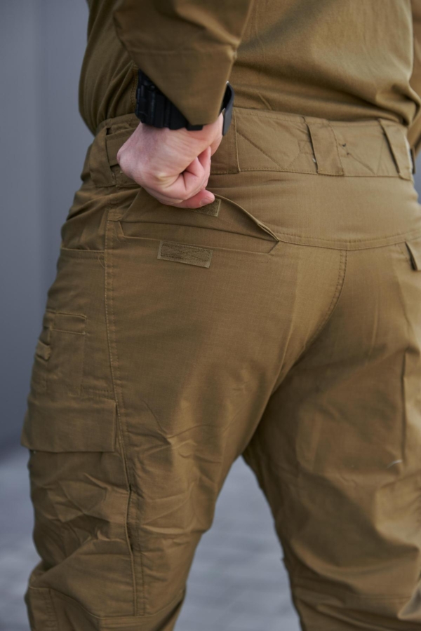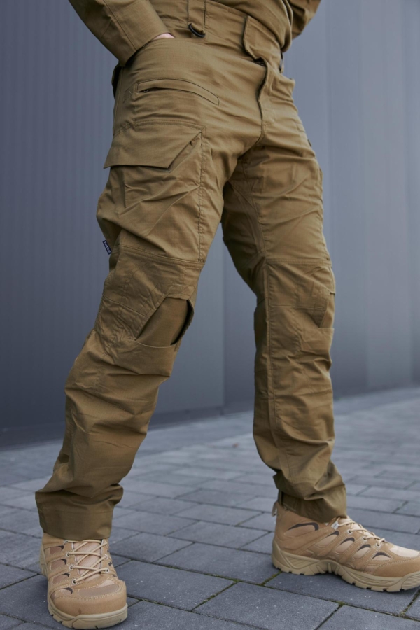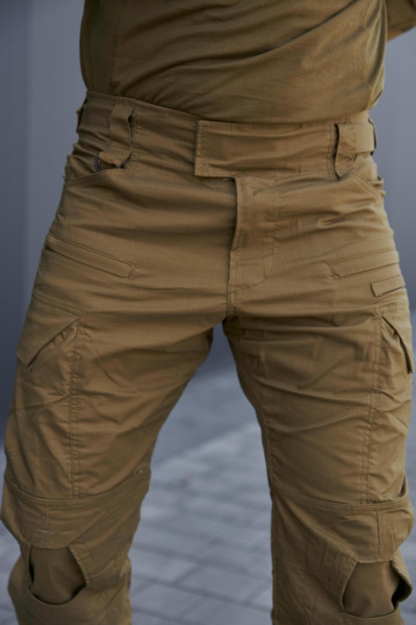 Штани обладнані відділами для зовнішніх наколінників, що підвищує захист під час інтенсивних навантажень. Низ штанин регулюється липучками, а в талії передбачене регулювання за допомогою задніх липучок, що дозволяє підігнати посадку індивідуально. Тканина ріп-стоп відзначається високою зносостійкістю та довговічністю.