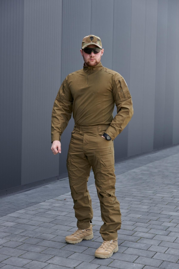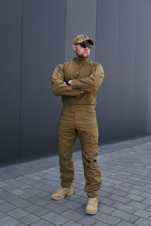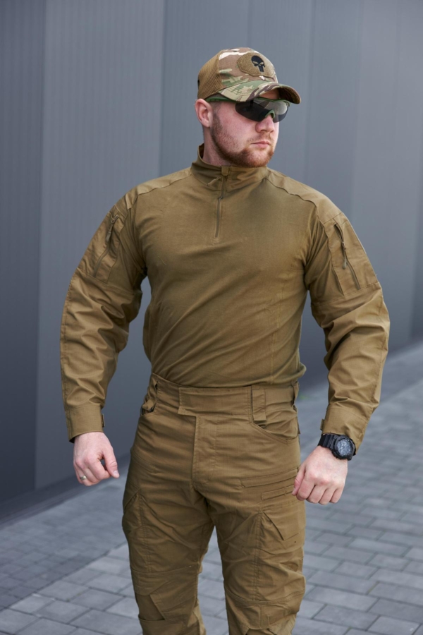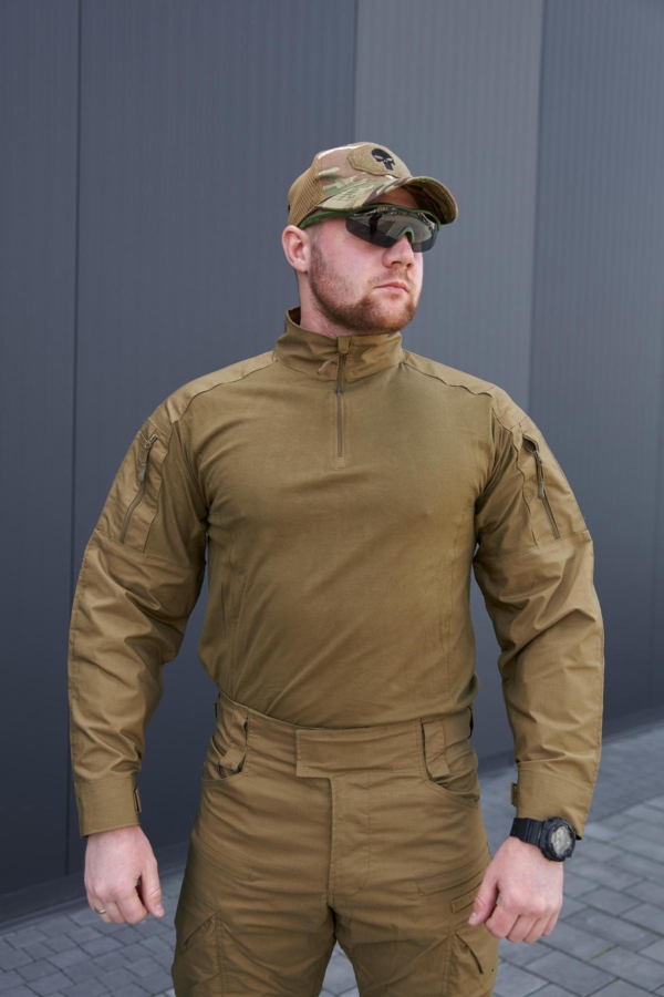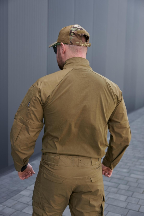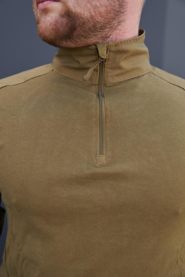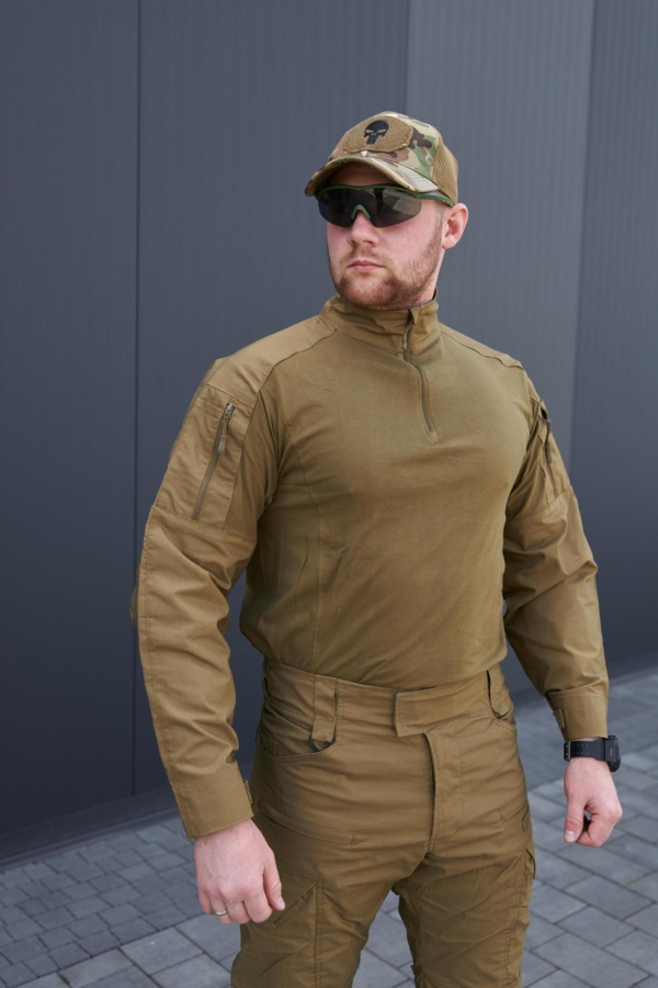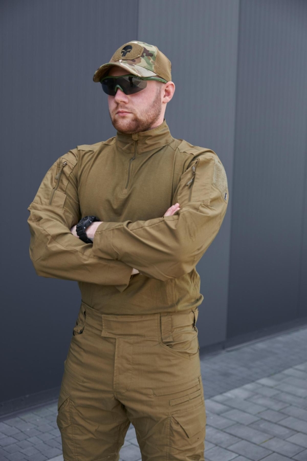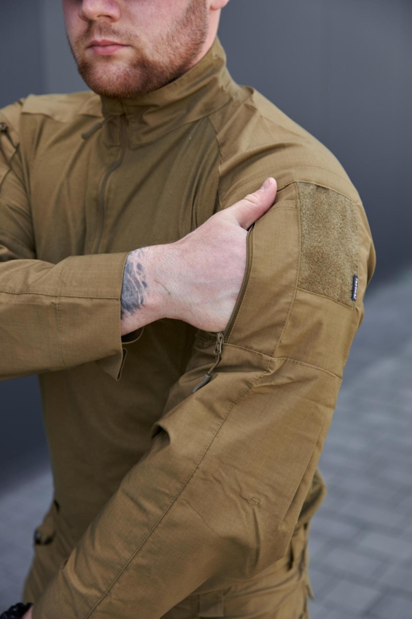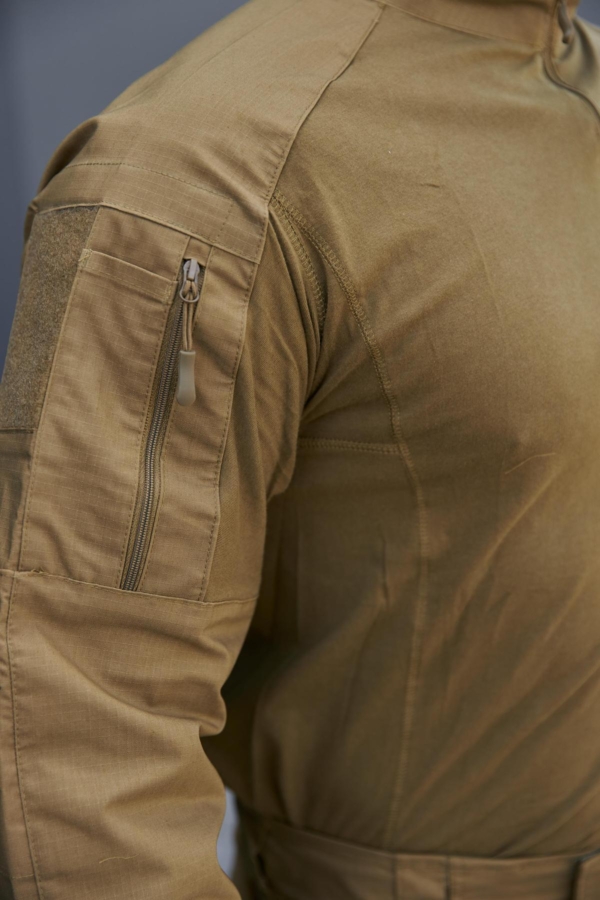 Сорочка виготовлена з міцної ріп-стоп тканини, а центральна частина — з бавовняного трикотажу, що забезпечує комфорт та свободу рухів. Передбачені кишені на блискавках на рукавах та м’які велкро-панелі для шевронів.