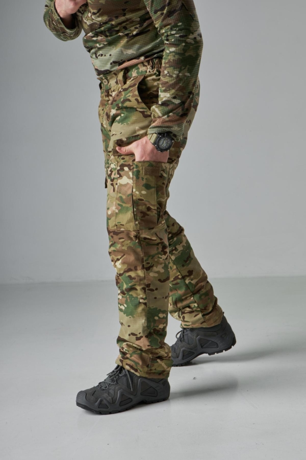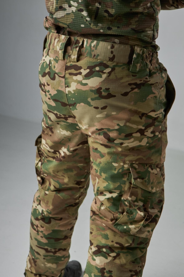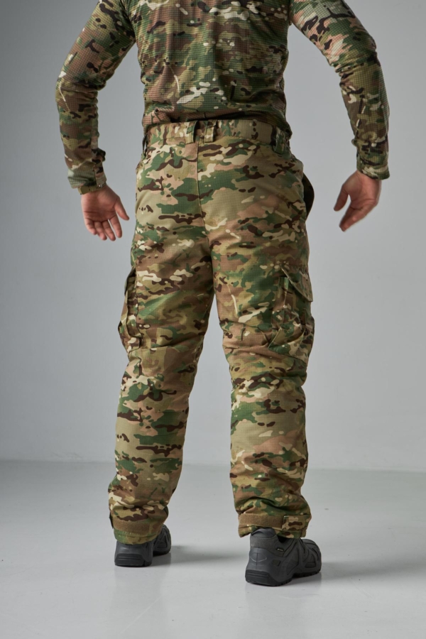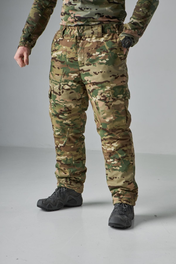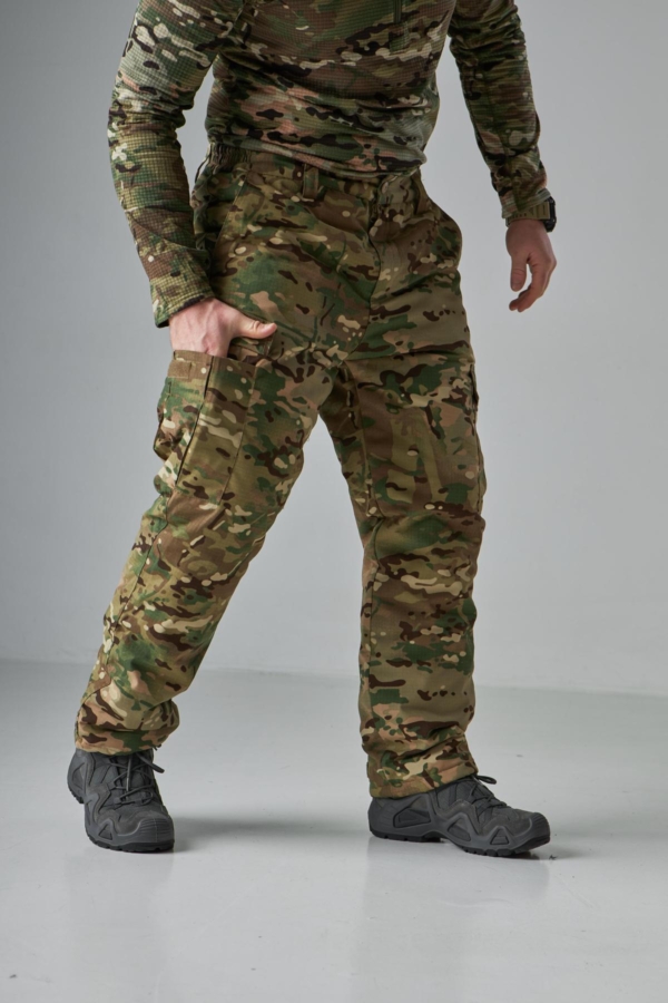 Штани мають вільний покрій, особливістю є дефлекторна підкладка, яка акумулює тепло в середині, є вшита резинка в талії для більшого комфортну, кишені по бокам на липучках, також регулюються бо обʼєму знизу штанини.