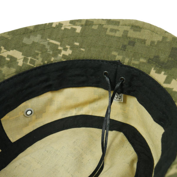 Панама виготовлена з міцної тканини Rip-Stop, яка завдяки армованій нитці у структурі відзначається підвищеною стійкістю до розривів. Матеріал складається з 50% бавовни та 50% поліестеру й має водовідштовхувальне просочення, що робить панаму практичною у використанні за різних умов.