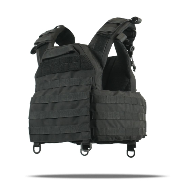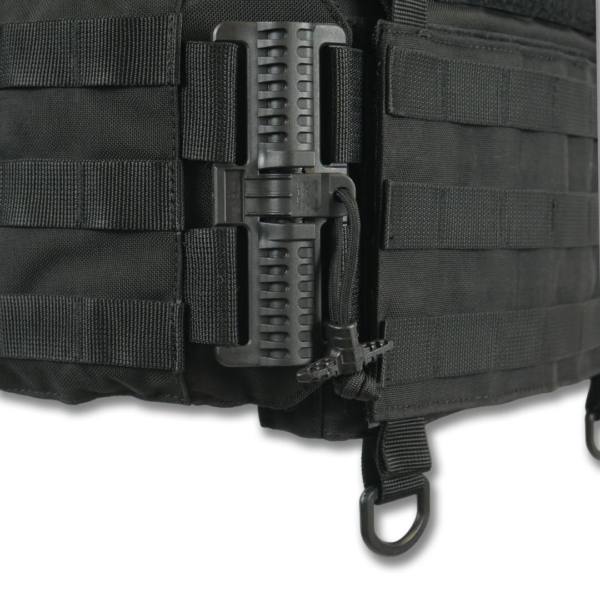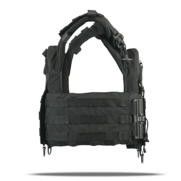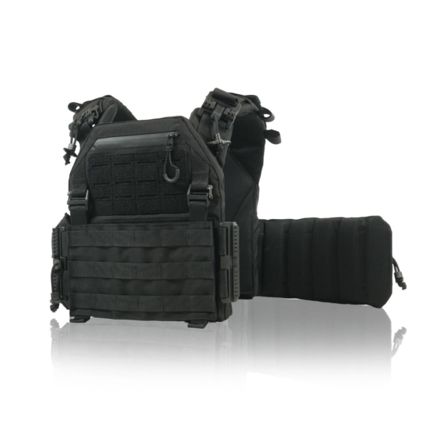 Сумісна зі стандартними плитами 25×30 мм зі скошеними верхніми кутами товщиною до 30 мм. Оснащена з’ємною передньою панеллю Molle, яка кріпиться на Velcro та карабіни Woojin. Панель можна швидко замінити на іншу з готовим набором підсумків.