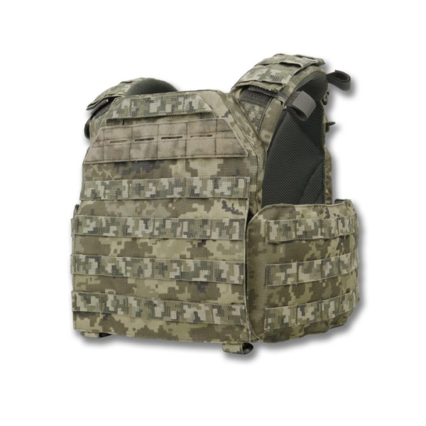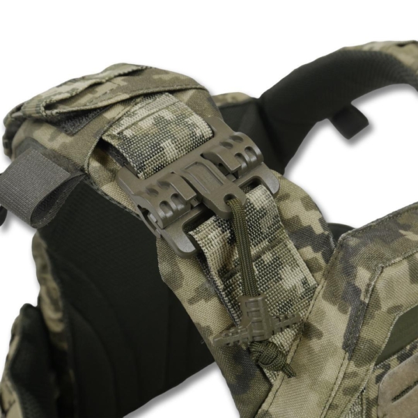 Подвійна система швидкого скидання в зоні плечей та боків дозволяє швидко зняти плитоноску в екстреній ситуації, потягнувши за паракорд. Швидке вдягання забезпечує комфорт навіть у динамічних умовах.