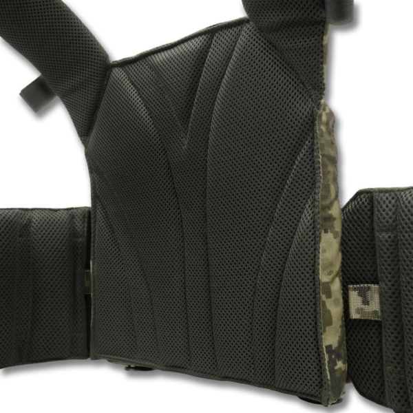 Камербанди знімні, з демпферами, розділеними на 5 секцій для кращої гнучкості та вентиляції. Кріпляться на велкро-панелі з обох боків, мають вставки з еластичної резинки 100 мм. Оснащені трьома рядами строп Molle та кишенею для додаткових захисних пакетів 1 або 2 класу від Militex.