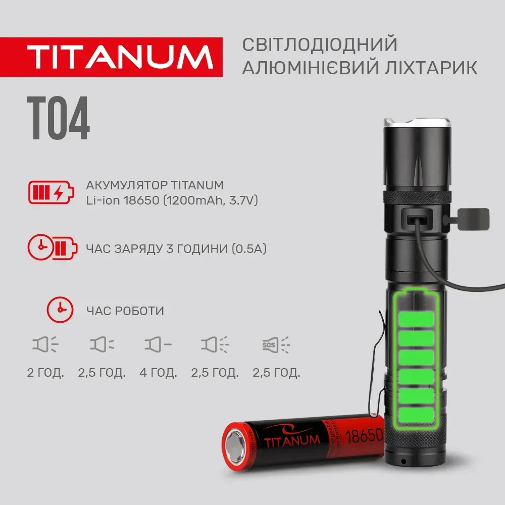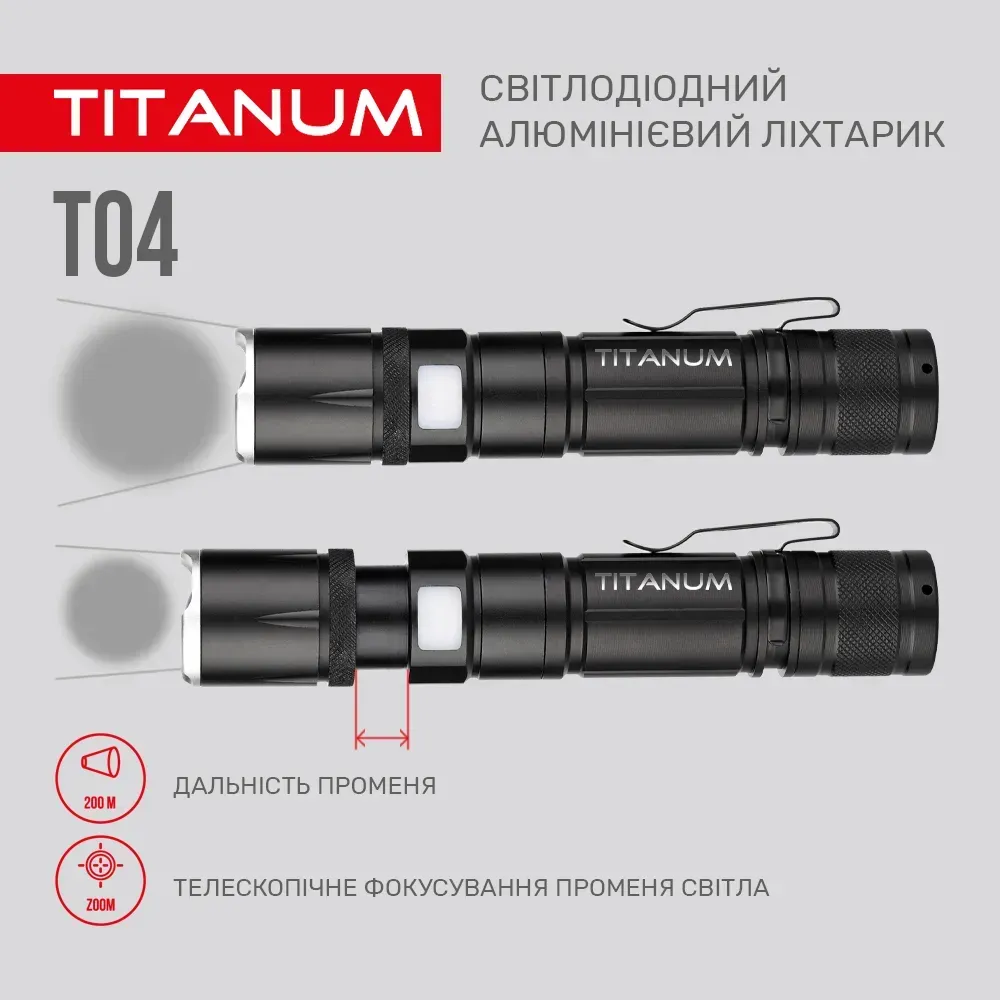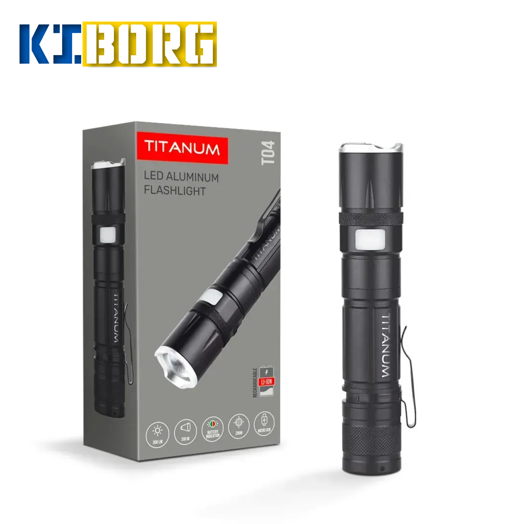 Портативний світлодіодний ліхтарик TITANUM TLF-T04 300Лм 6500K має зручну ергономічну форму, відмінно лежить в руці. Комплектується кліпсою за допомогою якої ліхтарик можна носити на рюкзаку, ремені, бейсболці та інших місцях, де це можливо Підходить для застосування у побуті, гаражі, риболовлі чи туризмі, зокрема для освітлення предметів, об’єктів чи зон, як в приміщеннях, так і на вулиці. Особливістю даної моделі є можливість регулювання фокусу променю світла та змінний акумулятор, який в разі потреби без проблем можна швидко змінити. Акумулятор йде в комплекті.
