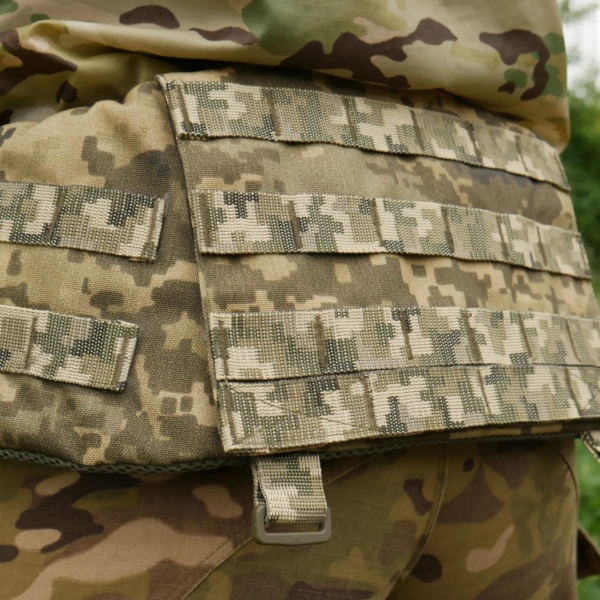 - Система MOLLE: три ряди збоку та чотири ряди ззаду.