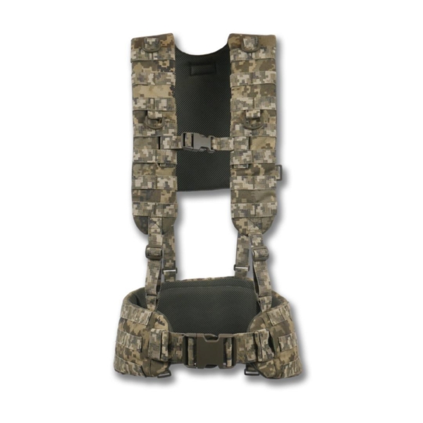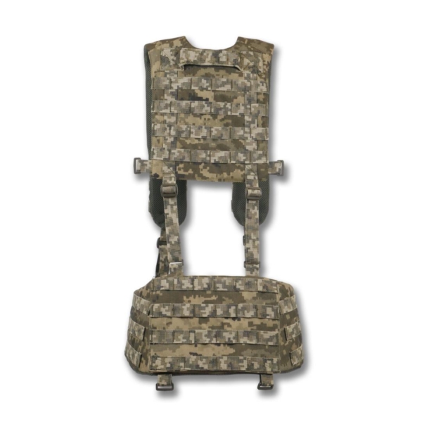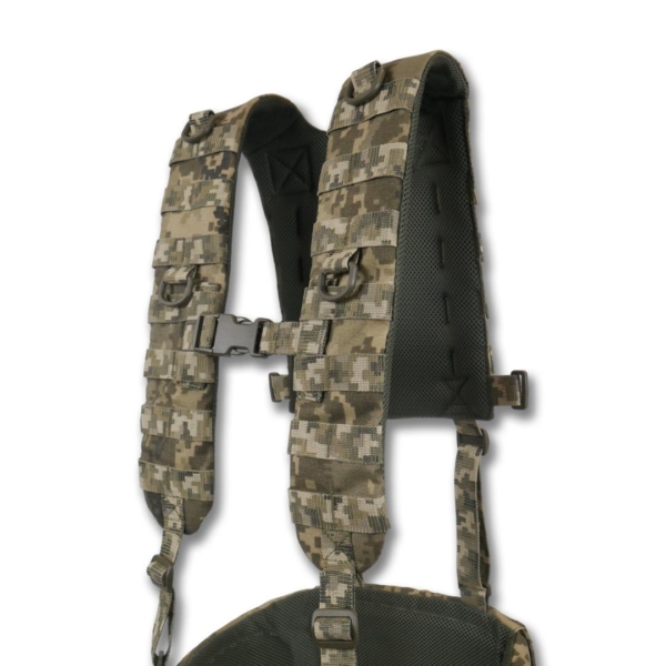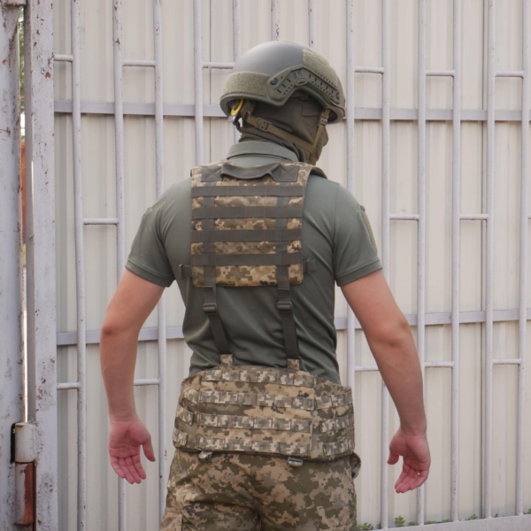Плечові лямки для пояса мають рюкзачну конструкцію з комірками molle на спині, додатковим ременем на фастексі та евакуаційною ручкою. Зовнішній матеріал — Cordura 1000D, стропи поліамідні. Усередині використано наповнювач Polifoam 5 мм і 3D-сітку товщиною 1,5 мм для вентиляції. На лямках — по 7 рядів molle та по два D-кільця. Фіксація здійснюється ремінними стропами шириною 2,5 см через двощілинні пряжки.