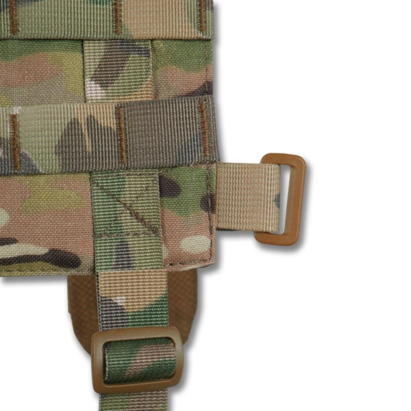 - Конструкція рюкзачного типу з MOLLE-інтерфейсом на спині та передніх лямках (по 7 рядів спереду, 4 ззаду).