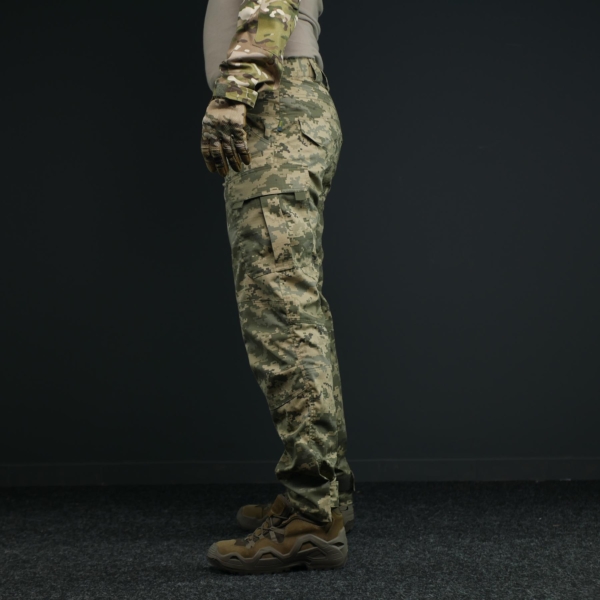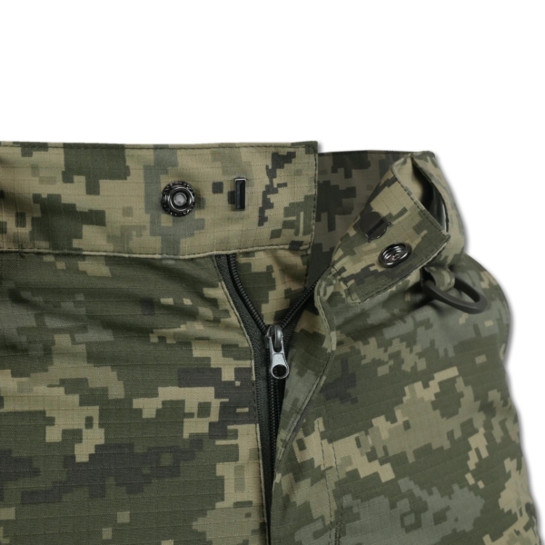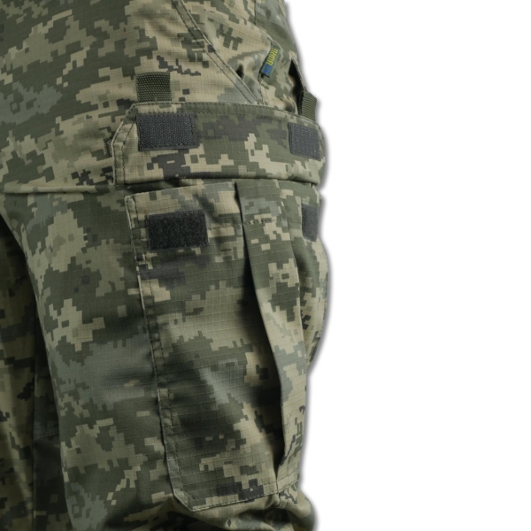 Передбачено 6 кишень: задні на липучці, класичні глибокі, бічні з клапанами на липучці, кишеня під ліхтарик чи інший інструмент. Низ штанів регулюється по ширині, встановлена фурнітура Woojin для карабінів, кнопка Каппа та блискавка з посиленою спіраллю.