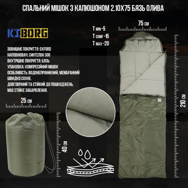 Спальний мішок з капюшоном 2.10х75 бязь олива