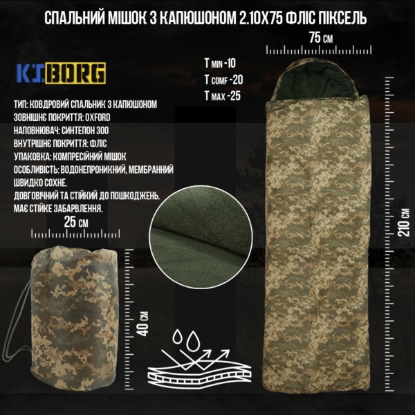 Спальний мішок з капюшоном 2.10х75 фліс піксель