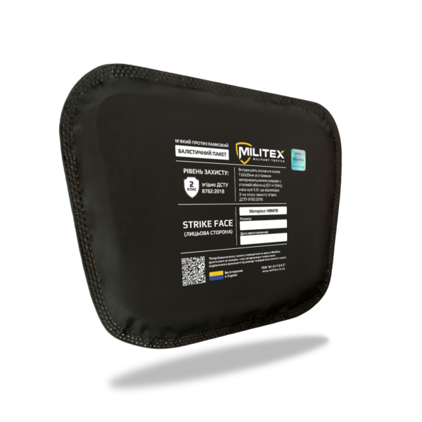 Балістичний пакет Militex: UHMWPE, водонепроникний чохол із нейлону 170 г/м² з TPU-покриттям, ультразвукова запайка. Витримує постріли 7,62×25 мм згідно з вимогами ДСТУ 8782:2018 щодо 2 класу захисту.