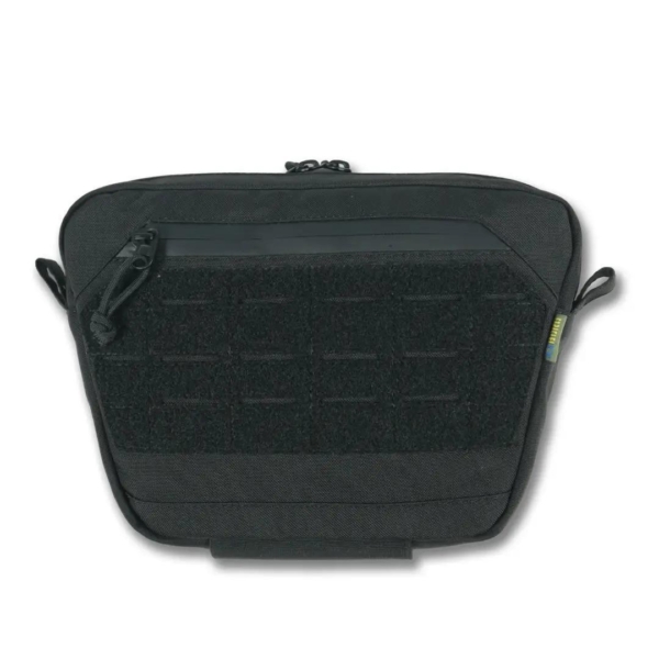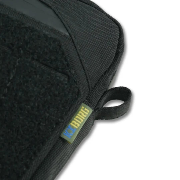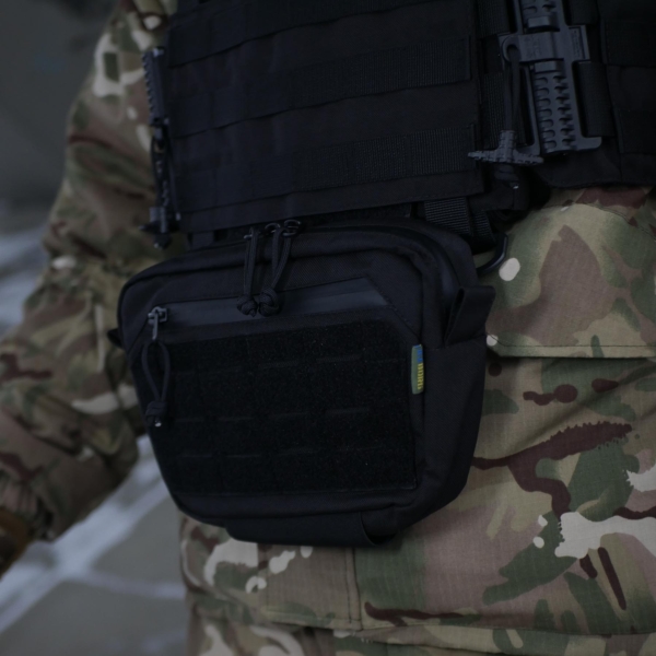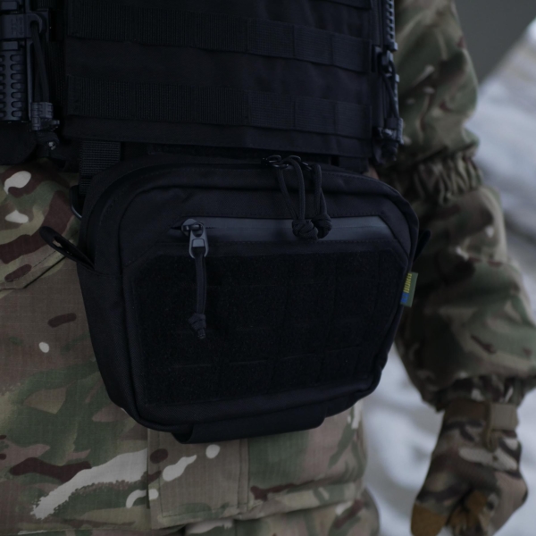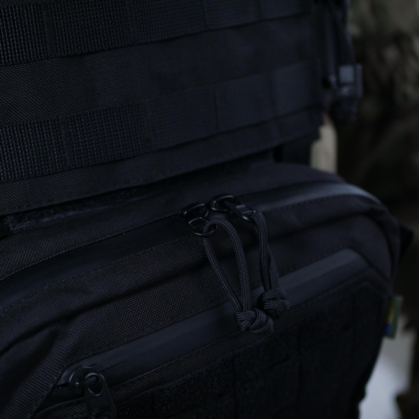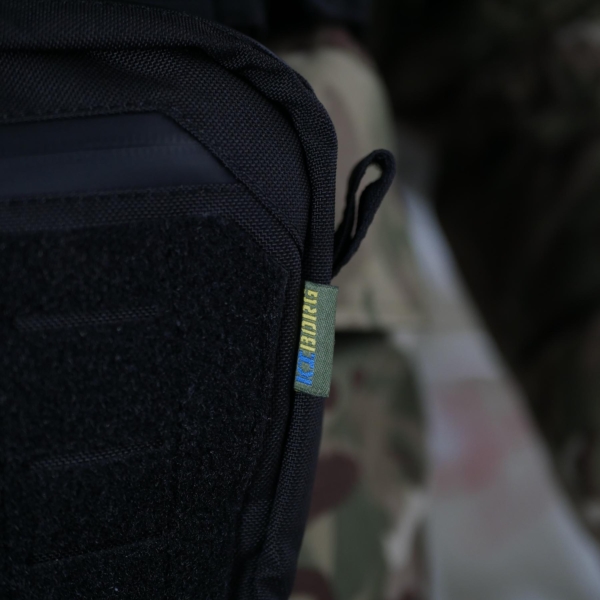 Сумка-напашник Kiborg розміру M виготовлена з Cordura 1000D 380 г/м² з NIR-просоченням і подвійним поліуретановим покриттям, стійка до вологи, мастил, стирання та вигорання. Має прорезинену блискавку з двома бігунками та пулером WJ для швидкого доступу, кріплення на велкро, фронтальну LaserCut панель з MOLLE для патчів і спорядження. Оснащена чотирма відділеннями (три внутрішні та одне фронтальне) і задньою кишенею під балістичний пакет 1 класу від Militex. Знизу розміщене еластичне кріплення для турнікета шириною 10 см.