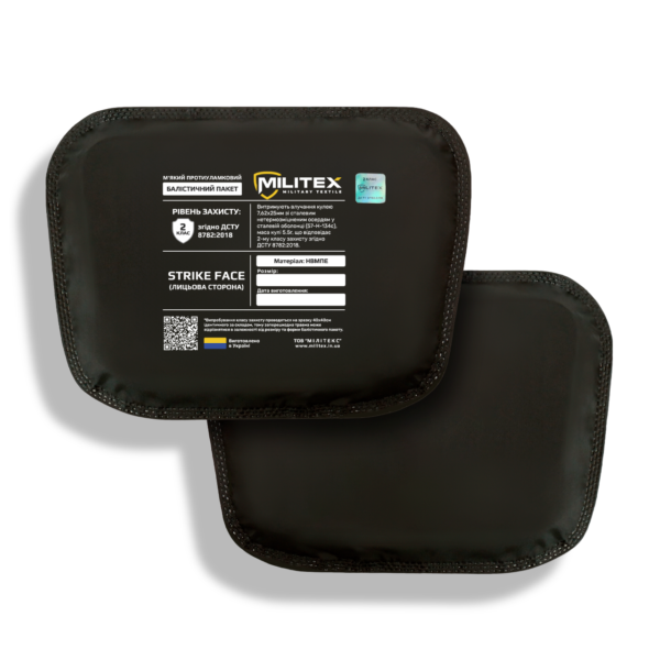 Балістичний пакет розміром 20,5×13×16 см виготовлений з UHMWPE, у чохлі з водонепроникного нейлону 170 г/м² з поліуретановим покриттям та ультразвуковою запайкою швів. Має український сертифікат випробувань і здатний витримувати постріли калібру 7,62×25 мм згідно з вимогами ДСТУ 8782:2018 для 2 класу захисту.
