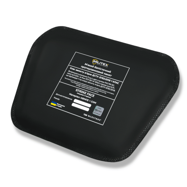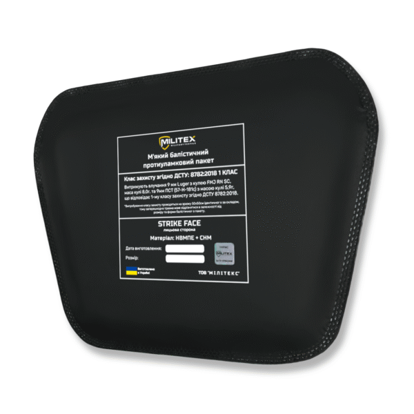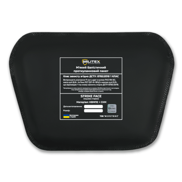 Пакет відповідає вимогам 1 класу захисту ДСТУ 8782:2018 і витримав випробування кулями калібру 9×18 мм та 9×19 мм Luger.